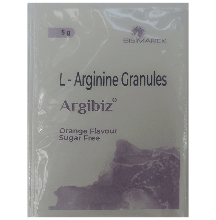 Manufacturer details:                                        Marketer details:Bismarck Pharmaceuticals Pvt. Ltd. | FF-13, SATYAM ARCADE OPP MORAIYA PATIYA AHMEDABAD,                                                Description:Argibiz Sachet Orange Sugar Free is a non-essential amino acid. It is used in the treatment of nutritional deficiencies. It helps to improve vascular and heart health. Additionally, it promotes muscle growth, thus can also be used for bodybuilding. Argibiz Sachet Orange Sugar Free should be taken in the dose and duration as advised by the doctor. An overdose of this medicine may have harmful effects on your health. It can be taken with or without food.This medicine is usually safe, however, it may cause nausea, bloating, and diarrhea, etc. as side effects. Some people may also experience low blood pressure after taking the medicine.Patients with a history of acute heart disease should take this medicine only when prescribed by the doctor. During the course of the treatment, your doctor may suggest some diagnostic and laboratory (blood and urine) tests to know the effects of the medicine on the body.