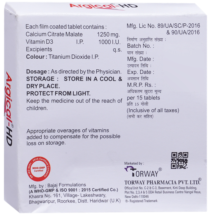 Manufacturer details:Bajaj Formulations | Khasra No. 161, Village- Lakeshwary Bhagwanpur, Roorkee Distt. Haridwar (U.K)                                        Marketer details:Torway Pharmacia Pvt Ltd | C-3&4, Kirti Deep Building, Nangal Raya Shopping Complex, Janak Puri, New Delhi-110064,                                                Description:Argical HD Tablet is a nutritional supplement used in the treatment of calcium deficiency. It is prescribed when your diet alone cannot provide the necessary calcium your body needs. It increases the absorption of calcium and helps to prevent or treat low blood calcium levels. Argical HD Tablet may be taken with or without food. Take it in the dose and duration advised by the doctor. Take it regularly at the same time each day to get maximum benefits from it. Do not take it more than or longer than prescribed by the doctor, as that may cause harmful effects.It may cause constipation and upset stomach in some people. If you experience any such symptoms on taking the medicine, let your doctor know. They may be able to suggest ways to reduce or prevent the side effects. Before taking the medicine, let your doctor know if you have any preexisting medical conditions or if you are taking any other medications. This will ensure your safety to use this medicine.