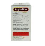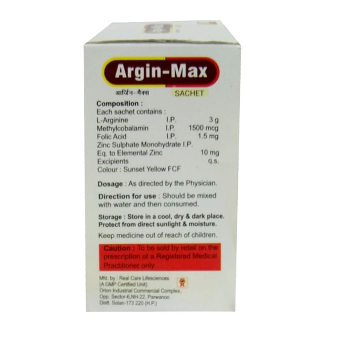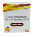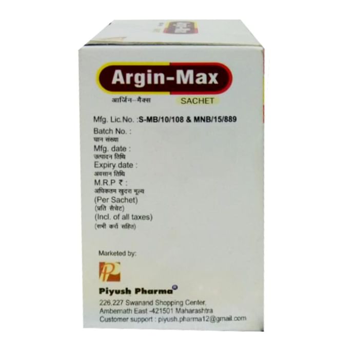 Manufacturer details:                                        Marketer details:Piyush Pharma | PIYUSH PHARMA OFFICE NO 226 ,227 2ND FLOOR SWANAND SHOPPING CENTRE AMBERNATH EAST DIST THANE MAHARASHTRA 421501 CONTACT NO 9225622015,                                                Description:Argin-Max Sachet Orange Sugar Free is a combination of vitamins and mineral supplements prescribed to treat vitamin and other nutritional deficiencies. It ensures the proper growth and functioning of the body and strengthens immunity. Argin-Max Sachet Orange Sugar Free may be taken with or without food. However, it should be used in the dose and duration prescribed by your doctor. Taking more than the recommended dose may cause undesirable side effects. Also, it is advised to take this medicine at a fixed time to avoid missing a dose.This medicine is usually a safe medicine with very minimal or no side effects. However, if you experience severe diarrhea, vomiting, or constipation, consult your doctor without delay.Before taking Argin-Max Sachet Orange Sugar Free, tell your doctor if you have any other health conditions. Inform them if you are taking any other medicines or are pregnant or breastfeeding. It is advised not to consume alcohol after taking this medicine.