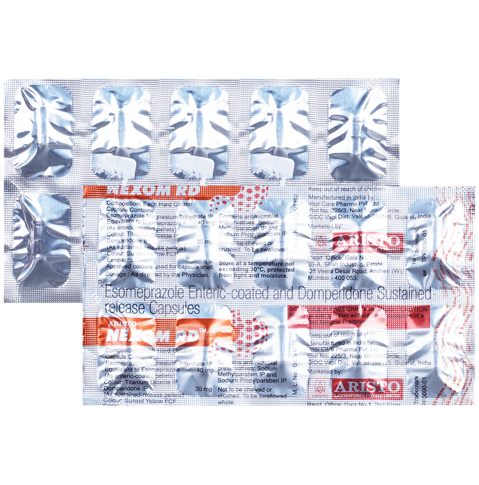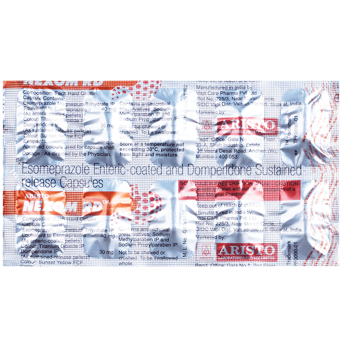 In Treatment of Gastroesophageal reflux disease (Acid reflux) Gastroesophageal reflux disease (GERD) is a chronic (long-term) condition in which there is an excess production of acid in the stomach. Aristo Nexom RD Capsule SR reduces the amount of acid your stomach makes and relieves the pain associated with heartburn and acid reflux. You should take it exactly as it is prescribed for it to be effective.u003cbr>u003cbr>Some simple lifestyle changes can help reduce the symptoms of GERD. Think about what foods trigger heartburn and try to avoid them; eat smaller, more frequent meals; try to lose weight if you are overweight and try to find ways to relax. Do not eat within 3-4 hours of going to bed.
