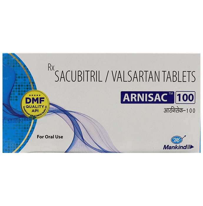Manufacturer details:                                        Marketer details:Mankind Pharma Ltd | 208, Okhla Industrial Estate, Phase III, New Delhi – 110020,                                                Description:Arnisac 100 Tablet is a combination of two medicines used to treat heart failure. It reduces the risk of hospitalization and death in patients with long-lasting (chronic) heart failure. It is generally given along with other heart failure medications. Arnisac 100 Tablet may be taken with or without food. Take it at the same time each day for maximum benefits. Your doctor will decide the dose and how often you take it, and it may change depending on how well you respond to the medicine. Keep taking the tablets regularly, as prescribed, and try not to miss doses to get the most benefit. Do not stop taking them, even if you are feeling well. The medicine prevents future complications.Common side effects of this medicine include low blood pressure (hypotension), impaired renal function, high potassium levels in the blood (hyperkalemia), cough, and dizziness. To reduce the risk of dizziness that may be caused by low blood pressure, try getting up slowly from a sitting or lying position. Tell your doctor if these or other side effects are severe or do not go away.Before taking this medicine, tell your doctor if you are taking any other medication for blood pressure or heart conditions or if you have kidney or liver disease. Also, let your doctor know all other medications you are using as they may affect, or be affected by, this medicine. This medicine should not be taken during pregnancy and is not recommended while breastfeeding. While on treatment with this medicine, your doctor may advise regular monitoring of blood pressure and regular kidney function.