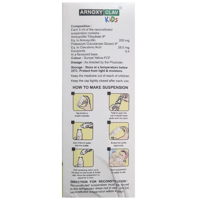Manufacturer details: Marketer details:Arnee Life Science | 803-A“C”Block Ganesh Meridian, Opp. Gujarat High Court, S.G. Highway, AHMEDABAD-380060, Description:Arnoxy Clav Kids Oral Suspension is an antibiotic medicine that helps treat bacterial infections of the ear, nose, throat, chest, lungs, teeth, skin, and urinary tract. It is capable of killing bacteria that have become resistant to other therapies and thus also helps treat tuberculosis that is resistant to other treatments. You can give Arnoxy Clav Kids Oral Suspension to your child with or without food. It is better to give it with food as that helps increase absorption and decrease the risk of stomach upset. The doctor may prescribe giving it two to three times a day. Medicine dose depends on the severity of the infection, its type, and your child’s body weight and age. So, stick to the dose, time, and way prescribed. If your child vomits the medicine within 30 minutes of intake, let the child calm down and repeat the dose. Do not double dose if it’s the time for the next dose.Arnoxy Clav Kids Oral Suspension may cause vomiting, diarrhea, nausea, abdominal pain, and allergy. These side effects should diminish on their own. But, in case they persist or start bothering your child, you must not delay speaking to your child’s doctor.Share your child’s entire medical history with the doctor, including any previous episode of allergy, heart problem, a blood disorder, birth defects, airway obstruction, lung anomaly, gastrointestinal problem, skin disorder, liver impairment, and kidney malfunction. This information will assist the doctor in making dose alterations and in planning your child’s overall treatment.