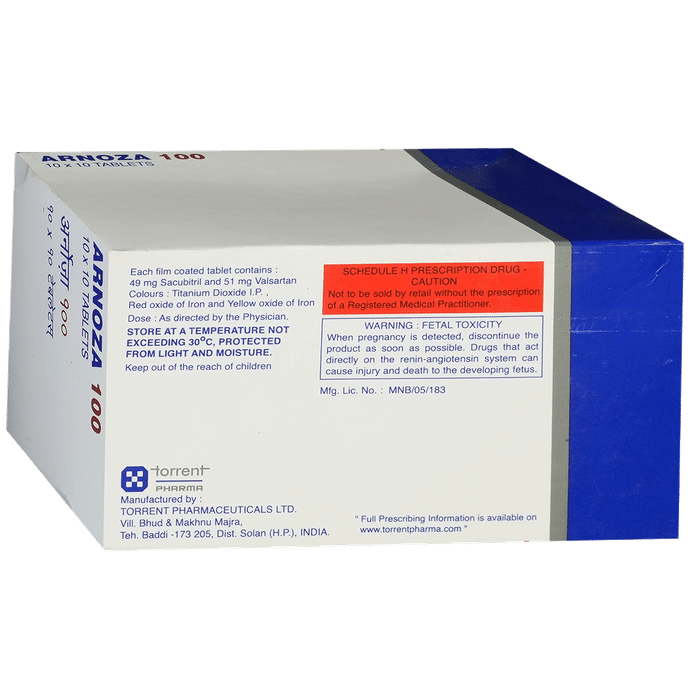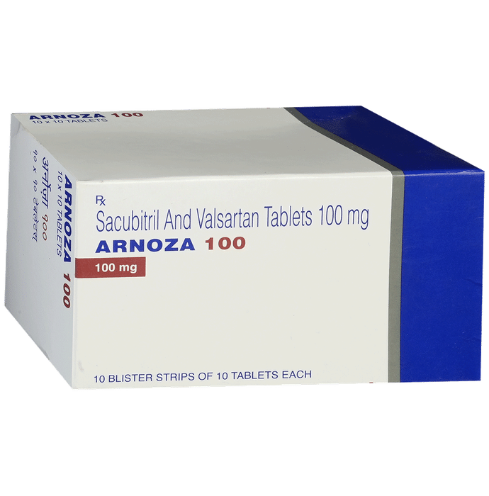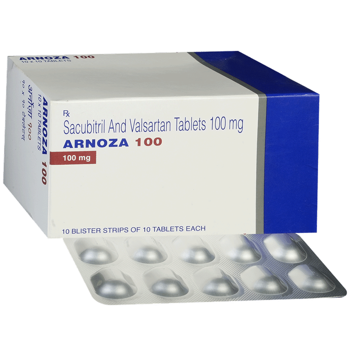 Manufacturer details:                                        Marketer details:Torrent Pharmaceuticals Ltd | Off. Ashram Road, Ahmedabad – 380 009., Gujarat, India,                                                Description:Arnoza 100 Tablet is a combination of two medicines used to treat heart failure. It reduces the risk of hospitalization and death in patients with long-lasting (chronic) heart failure. It is generally given along with other heart failure medications. Arnoza 100 Tablet may be taken with or without food. Take it at the same time each day for maximum benefits. Your doctor will decide the dose and how often you take it, and it may change depending on how well you respond to the medicine. Keep taking the tablets regularly, as prescribed, and try not to miss doses to get the most benefit. Do not stop taking them, even if you are feeling well. The medicine prevents future complications.Common side effects of this medicine include low blood pressure (hypotension), impaired renal function, high potassium levels in the blood (hyperkalemia), cough, and dizziness. To reduce the risk of dizziness that may be caused by low blood pressure, try getting up slowly from a sitting or lying position. Tell your doctor if these or other side effects are severe or do not go away.Before taking this medicine, tell your doctor if you are taking any other medication for blood pressure or heart conditions or if you have kidney or liver disease. Also, let your doctor know all other medications you are using as they may affect, or be affected by, this medicine. This medicine should not be taken during pregnancy and is not recommended while breastfeeding. While on treatment with this medicine, your doctor may advise regular monitoring of blood pressure and regular kidney function.