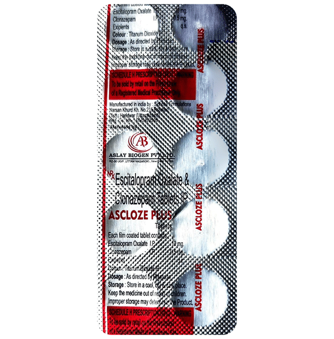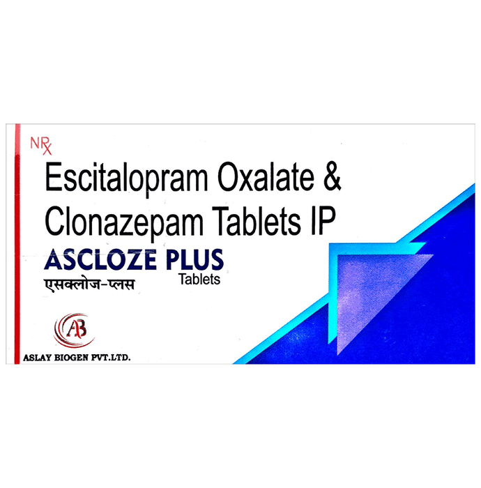 Manufacturer details:                                        Marketer details:Aslay Biogen Private Limited | B/304 ,MITRAMANDAL COLONY, SAKET VIHAR , PATNA,BIHAR-800002,                                                Description:Ascloze Plus Tablet is a prescription medicine used to treat anxiety disorder. It is the combination medicine that calms the brain by decreasing the abnormal and excessive activity of the nerve cells. It also works by increasing the level of a chemical messenger in the brain which improves mood. Ascloze Plus Tablet can be taken with or without food. However, it is advised to take it at the same time each day as this helps to maintain a consistent level of medicine in the body. Take this medicine in the dose and duration advised by your doctor as it has habit-forming potential. If you miss a dose of this medicine, take it as soon as you remember. Finish the full course of treatment even if you feel better. It is important not to stop taking this medicine suddenly as it may cause withdrawal symptoms.Some common side effects of this medicine include delayed ejaculation, low sexual desire, vomiting, memory impairment, depression, and confusion. It may also cause dizziness and sleepiness. So, do not drive or do anything that requires mental focus until you know how this medicine affects you. It may cause weight gain or weight loss depending upon person to person. To prevent weight gain, you can eat a balanced diet and exercise regularly. On the other hand, weight loss can be prevented by increasing food portions in your diet. It is important to inform your doctor if you develop any unusual changes in mood as it can cause suicidal thoughts.Take caution while taking medicine if you are suffering from liver disease. Your doctor should also know about all other medicines you are taking as many of these may make this medicine less effective or change the way it works. Inform your doctor if you are pregnant, planning pregnancy or breastfeeding.