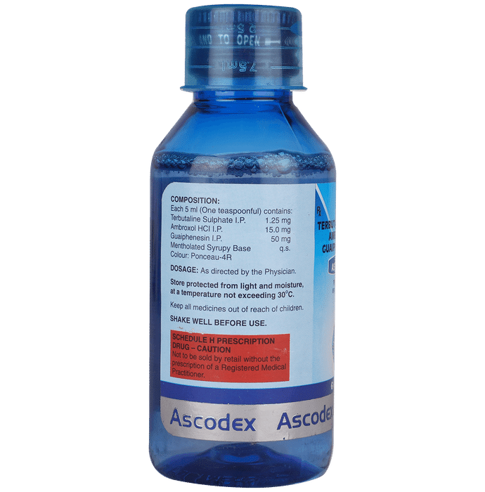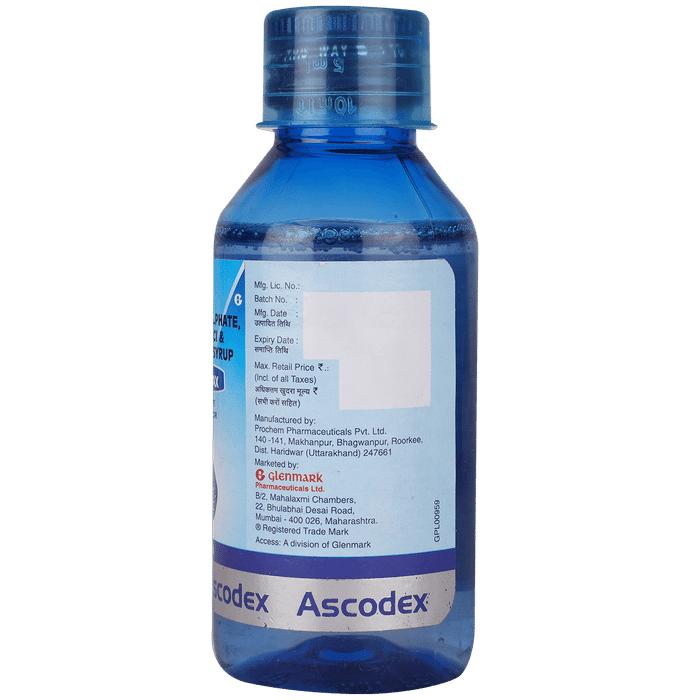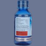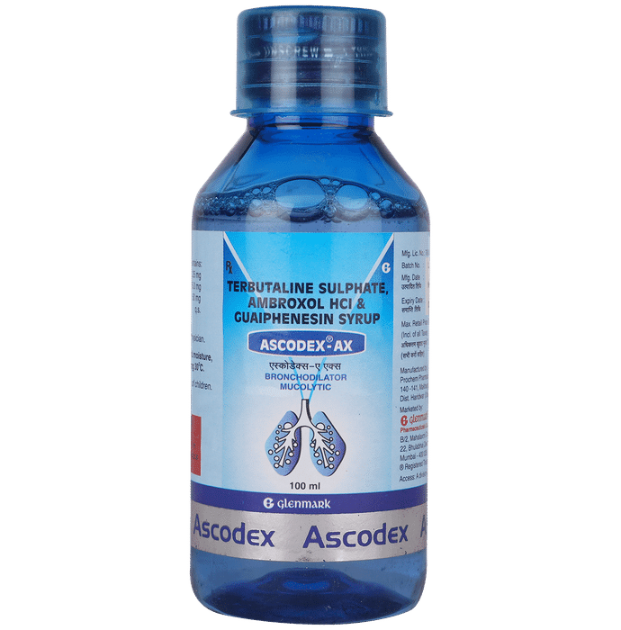 Manufacturer details:                                        Marketer details:Glenmark Pharmaceuticals Ltd | Glenmark Pharmaceuticals Limited, B/2, Mahalaxmi Chambers, 22, Bhulabhai Desai Road, Mumbai – 400 026.,                                                Description:Ascodex AX Syrup effectively treats wet cough (cough with mucus) in children. It helps in thinning the mucus by increasing its water content. This relieves throat irritation and clears congestion, enabling easy breathing in your child. Give Ascodex AX Syrup to your child orally, with or without food. Give it with food to reduce the chances of stomach upset. You may be required to give this medicine to your child for a few days to weeks, depending upon your child’s clinical condition and severity of the illness. Do not stop the medication abruptly by yourself, even if your child starts to feel better. Continue the medicine until the prescribed course is complete. Do not give more than the prescribed dose for fast relief as it may cause unwanted effects and worsen your child’s condition.If your child vomits soon after taking Ascodex AX Syrup, help the child calm down and repeat the same dose. Skip the dose if it is time for the next dose. Do not overdose to catch up for the missed one. Do not give this medicine to your child for the long term without consulting your child’s doctor. Check the medicine label thoroughly and never combine this medicine with other cold and flu medicines as that may lead to side effects.Ascodex AX Syrup may have some common and temporary side effects. These may include excessive salivation, fatigue, headache, dizziness, nausea, vomiting, diarrhea, stomach discomfort, irregular heartbeat, rash, tremors, and numbness or tingling sensation in the hands or feet. In case of worrisome episodes, call your child’s doctor right away.Narrate your child’s complete medical history, including any previous episode of respiratory illness, allergy, heart problems, blood disorders, birth defects, airway obstruction, lung anomaly, sinus issues, liver impairment, and kidney malfunction. This information is critical for dose alterations and for planning your child’s overall treatment.