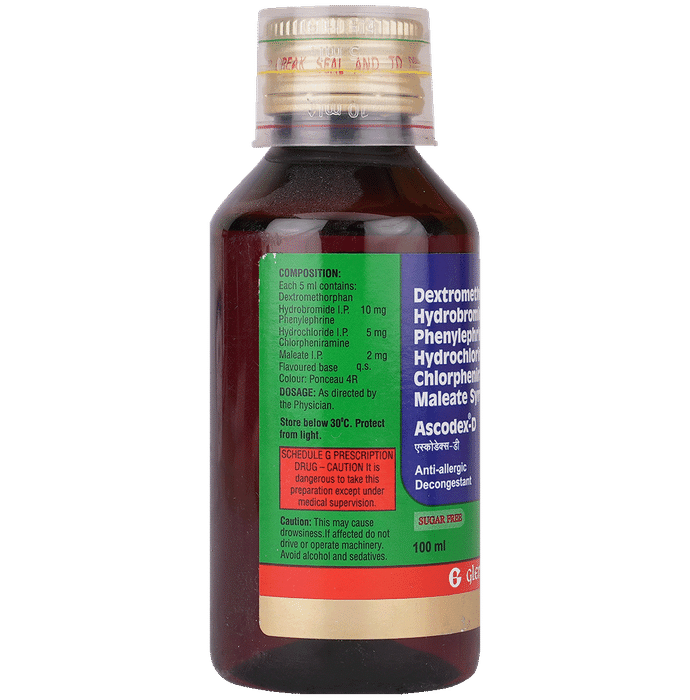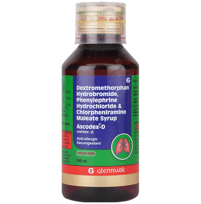 Manufacturer details:                                        Marketer details:Glenmark Pharmaceuticals Ltd | Glenmark Pharmaceuticals Limited, B/2, Mahalaxmi Chambers, 22, Bhulabhai Desai Road, Mumbai – 400 026.,                                                Description:Ascodex D Syrup is a medicine used in the treatment of common cold and cough. It can provide quick relief from cough and common cold symptoms like runny nose, stuffy nose, sneezing, watery eyes, and congestion or stuffiness. Ascodex D Syrup is taken with or without food in a dose and duration as advised by the doctor. The dose you are given will depend on your condition and how you respond to the medicine. You should keep taking this medicine for as long as your doctor recommends. If you stop treatment too early your symptoms may come back and your condition may worsen. Let your healthcare team know about all other medications you are taking as some may affect, or be affected by this medicine.Common side effects of this medicine include headache, sedation, double vision, vomiting, diarrhea, dry mouth, and nausea. Most of these are temporary and usually resolve with time. Contact your doctor straight away if you are at all concerned about any of these side effects. This medicine can also cause sleepiness, so do not drive or do anything that requires mental focus until you know how this medicine affects you. Avoid drinking alcohol while taking this medicine as it can worsen your sleepiness.Never support self-medication or recommend your medicine to another person. It is beneficial to have plenty of fluids while taking this medication. Before taking this medicine, you should tell your doctor if you are pregnant, planning pregnancy or breastfeeding. You should also tell your doctor if you have any kidney or liver diseases so that your doctor can prescribe a suitable dose for you.