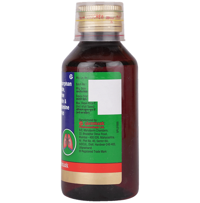 Package:Bottle,Qty:100 ml,Product Form:Syrup ,prescription_required:Prescription Required,Fact_Box:Habit Forming :: No|Therapeutic Class :: RESPIRATORY, primary_use:Treatment of Dry cough|Common cold,storage:Store below 30°C,                  common_side_effect:Sedation | Double vision | Vomiting | Diarrhea | Dryness in mouth | Nervousness | Headache | Nausea | Heartburn | Dizziness | Weakness | Insomnia (difficulty in sleeping) | Hallucination | Convulsion,      MANUFACTURER_ADDRESS:Glenmark Pharmaceuticals Limited, B/2, Mahalaxmi Chambers, 22, Bhulabhai Desai Road, Mumbai – 400 026.,        country_of_origin:India,Q_A:</q_a>,                            How it works:,