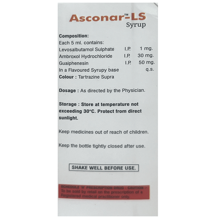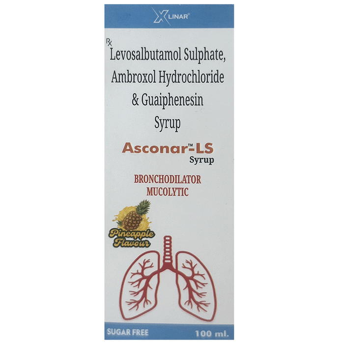 Manufacturer details:                                        Marketer details:Xlinar Pharmaceuticals Pvt Ltd | Majhigaon, Rangpo, District – Pakyong, Sikkim, India 737132,                                                Description:Asconar-LS Syrup Pineapple Sugar Free is used in the treatment of cough with mucus. It thins mucus in the nose, windpipe and lungs, making it easier to cough out. It also provides relief from runny nose, sneezing, itching, and watery eyes. Asconar-LS Syrup Pineapple Sugar Free is taken with or without food in a dose and duration as advised by the doctor. The dose you are given will depend on your condition and how you respond to the medicine. You should keep taking this medicine for as long as your doctor recommends. If you stop treatment too early your symptoms may come back and your condition may worsen. Let your healthcare team know about all other medications you are taking as some may affect, or be affected by this medicine.The most common side effects are dizziness, vomiting, change in taste, diarrhea, headache, and rashes. Most of these are temporary and usually resolve with time. Contact your doctor straight away if you are at all concerned about any of these side effects. This medicine can also cause sleepiness, so do not drive or do anything that requires mental focus until you know how this medicine affects you. Avoid drinking alcohol while taking this medicine as it can make sleepiness worse.Never support self-medication or recommend your medicine to another person. It is beneficial to have plenty of fluids while taking this medication. Before taking this medicine, you should tell your doctor if you are pregnant, planning pregnancy or breastfeeding. You should also tell your doctor if you have any kidney or liver diseases so that your doctor can prescribe a suitable dose for you.
