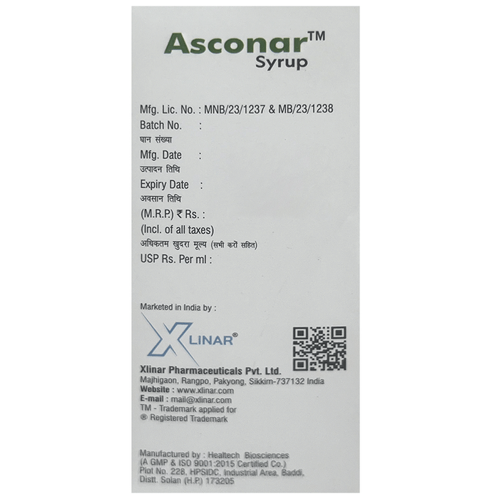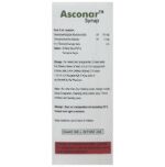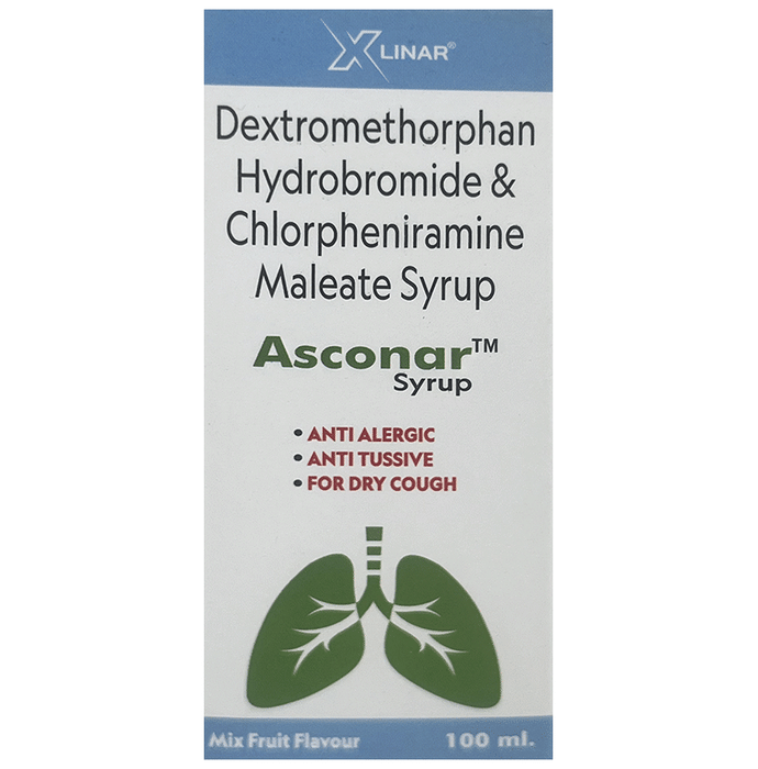 Manufacturer details:                                        Marketer details:Xlinar Pharmaceuticals Pvt Ltd | Majhigaon, Rangpo, District – Pakyong, Sikkim, India 737132,                                                Description:Asconar Syrup Mix Fruit Flavour is a combination of two medicines used in the treatment of dry cough. It can provide temporary relief of cough due to throat irritation, sneezing, and running nose. It works by reducing the activity of the brain’s cough center and blocking the effects of histamine. Asconar Syrup Mix Fruit Flavour is taken with or without food in a dose and duration as advised by the doctor. The dose you are given will depend on your condition and how you respond to the medicine. You should keep taking this medicine for as long as your doctor recommends. If you stop treatment too early your symptoms may come back and your condition may worsen. Let your doctor know about all other medications you are taking as some may affect, or be affected by this medicine.The most common side effects are sedation, somnolence, and dizziness. Most of these are temporary and usually resolve with time. Contact your doctor straight away if you are at all concerned about any of these side effects. If you experience dizziness and sleepiness, so do not drive or do anything that requires mental focus until you know how this medicine affects you. Avoid drinking alcohol while taking this medicine as it can make dizziness worse.It is beneficial to have plenty of fluids while taking this medication. Before taking it, you should tell your doctor if you have liver diseases so that your doctor can prescribe a suitable dose for you. Pregnant or breastfeeding women should also consult their doctor before taking this medicine.