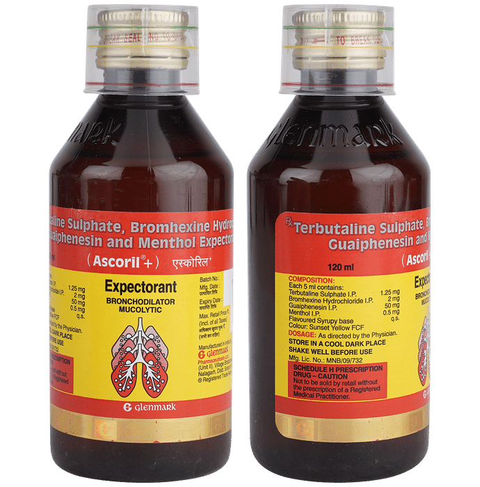 Manufacturer details:                                        Marketer details:Glenmark Pharmaceuticals Ltd | Glenmark Pharmaceuticals Limited, B/2, Mahalaxmi Chambers, 22, Bhulabhai Desai Road, Mumbai – 400 026.,                                                Description:Ascoril Plus Expectorant is used in the treatment of cough. It thins mucus in the nose, windpipe and lungs, making it easier to cough out. It also produces a sensation of coolness and relieves minor throat irritation. Ascoril Plus Expectorant is taken with or without food in a dose and duration as advised by the doctor. The dose you are given will depend on your condition and how you respond to the medicine. You should keep taking this medicine for as long as your doctor recommends. If you stop treatment too early your symptoms may come back and your condition may worsen. Let your doctor know about all other medications you are taking as some may affect, or be affected by this medicine.The most common side effects are nausea, indigestion, bloating, vomiting, diarrhea, stomach pain, headache, sweating, skin rash, tremors, and increased heart rate. Most of these are temporary and usually resolve with time. Contact your doctor straight away if you are at all concerned about any of these side effects. This medicine can also cause sleepiness, so do not drive or do anything that requires mental focus until you know how this medicine affects you. Avoid drinking alcohol while taking this medicine as it can make sleepiness worse.Never support self-medication or recommend your medicine to another person. It is beneficial to have plenty of fluids while taking this medication. Before taking this medicine, you should tell your doctor if you are pregnant, planning pregnancy or breastfeeding.
