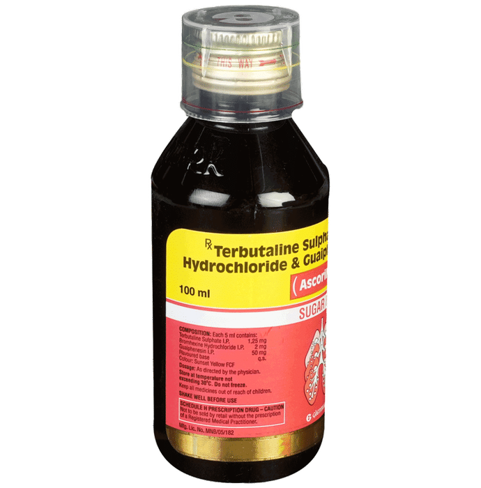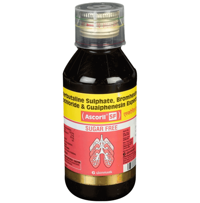 Manufacturer details:                                        Marketer details:Glenmark Pharmaceuticals Ltd | Glenmark Pharmaceuticals Limited, B/2, Mahalaxmi Chambers, 22, Bhulabhai Desai Road, Mumbai – 400 026.,                                                Description:Ascoril SF Expectorant is used in the treatment of cough with mucus. It thins mucus in the nose, windpipe, and lungs, making it easier to cough out. It also provides relief from runny nose, sneezing, itching, and watery eyes. Ascoril SF Expectorant is taken with or without food in a dose and duration as advised by the doctor. The dose you are given will depend on your condition and how you respond to the medicine. You should keep taking this medicine for as long as your doctor recommends. If you stop treatment too early your symptoms may come back and your condition may worsen. Let your doctor know about all other medications you are taking as some may affect, or be affected by this medicine.The most common side effects are nausea, diarrhea, bloating, indigestion, vomiting, stomach pain, sweating, headache, skin rash, tremor, and increased heart rate. Most of these are temporary and usually resolve with time. Contact your doctor straight away if you are at all concerned about any of these side effects. This medicine can also cause sleepiness, so do not drive or do anything that requires mental focus until you know how this medicine affects you. Avoid drinking alcohol while taking this medicine as it can make sleepiness worse.Never support self-medication or recommend your medicine to another person. It is beneficial to have plenty of fluids while taking this medication. Before taking this medicine, you should tell your doctor if you are pregnant, planning pregnancy, or breastfeeding. You should also tell your doctor if you have any kidney or liver diseases so that your doctor can prescribe a suitable dose for you.