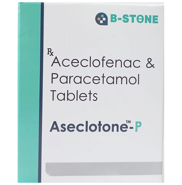 Manufacturer details:                                                                                Marketer details:B-Stone Pharmaceutical & Healthcare Pvt Ltd | BARAGAON AKBARPUR, GONDA ROAD, DIGSI, Aligarh, Uttar Pradesh, 202002,                                                                                                Description:Aseclotone-P Tablet is a pain-relieving medicine. It is used to reduce pain and inflammation in conditions like rheumatoid arthritis, ankylosing spondylitis, and osteoarthritis. It may also be used to relieve muscle pain, back pain, toothache, or pain in the ear and throat. Aseclotone-P Tablet should be taken with or without food. You should take it regularly as advised by your doctor. Your doctor may change the dose and time between doses according to your pain level and your needs. Do not take more or use it for a longer duration than recommended by your doctor.Some of the common side effects of this medicine include nausea, vomiting, stomach pain, heartburn, and diarrhea. If any of these side effects bother you or do not go away with time, you should let your doctor know. Your doctor may help you with ways to reduce or prevent these side effects by prescribing an alternative medicine or adjusting the dose.Aseclotone-P Tablet may not be suitable for everybody. Before taking it, let your doctor know if you have any problems with your heart, kidneys, liver, or have stomach ulcers. To make sure it is safe for you, let your doctor know about all the other medicines you are taking. Pregnant and breastfeeding mothers should first consult their doctors before using Aseclotone-P Tablet.