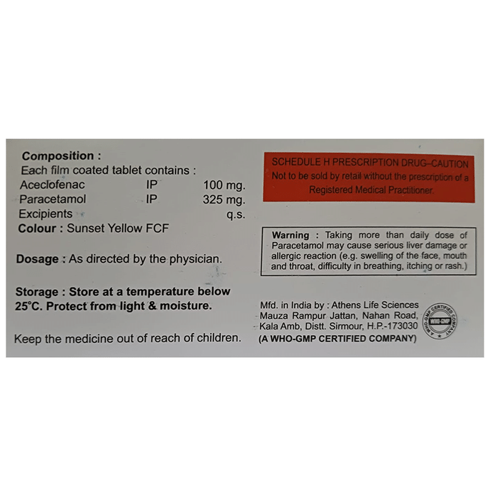 Marketer:Strebi Pharmaceuticals Private Limited,Composition:Aceclofenac (100mg) + Paracetamol (325mg),medicine_type:,