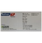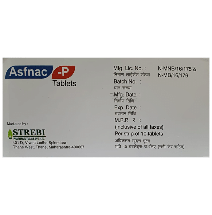 Manufacturer details:                                                                                Marketer details:Strebi Pharmaceuticals Private Limited | W. NO. 12, TIRATH NAGAR, BADHI MAIRA ROAD P.O. PANSARA TEHSIL JAGADHRI YAMUNA NAGAR YAMUNA NAGAR HR 135001 IN,                                                                                                Description:Asfnac-P Tablet is a pain-relieving medicine. It is used to reduce pain and inflammation in conditions like rheumatoid arthritis, ankylosing spondylitis, and osteoarthritis. It may also be used to relieve muscle pain, back pain, toothache, or pain in the ear and throat. Asfnac-P Tablet should be taken with or without food. You should take it regularly as advised by your doctor. Your doctor may change the dose and time between doses according to your pain level and your needs. Do not take more or use it for a longer duration than recommended by your doctor.Some of the common side effects of this medicine include nausea, vomiting, stomach pain, heartburn, and diarrhea. If any of these side effects bother you or do not go away with time, you should let your doctor know. Your doctor may help you with ways to reduce or prevent these side effects by prescribing an alternative medicine or adjusting the dose.Asfnac-P Tablet may not be suitable for everybody. Before taking it, let your doctor know if you have any problems with your heart, kidneys, liver, or have stomach ulcers. To make sure it is safe for you, let your doctor know about all the other medicines you are taking. Pregnant and breastfeeding mothers should first consult their doctors before using Asfnac-P Tablet.