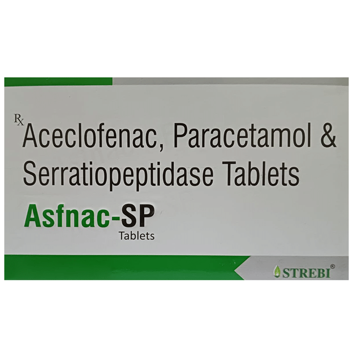 Manufacturer details: Marketer details:Strebi Pharmaceuticals Private Limited | W. NO. 12, TIRATH NAGAR, BADHI MAIRA ROAD P.O. PANSARA TEHSIL JAGADHRI YAMUNA NAGAR YAMUNA NAGAR HR 135001 IN, Description:Asfnac-SP Tablet is a combination medicine used to relieve pain and swelling in various conditions like muscle pain, joint pain, and postoperative pain. Thus, it effectively alleviates pain and inflammation in conditions like rheumatoid arthritis, ankylosing spondylitis, and osteoarthritis. Asfnac-SP Tablet should be taken in the dose and duration as advised by your doctor. It should be taken with food or milk to prevent stomach upset. Taking the medicine regularly at the right times increases its effectiveness. It is important to keep taking the medicine regularly until your doctor tells you it is safe to stop.Nausea, vomiting, stomach pain, indigestion, heartburn, increased liver enzymes, dizziness,drowsiness, and diarrhea are some of the common side effects that might be observed on taking this medicine. Your doctor may regularly monitor your kidney function, liver function, and levels of blood components if you are taking this medicine for long-term treatment. Long-term use may lead to serious complications such as stomach bleeding and kidney problems. Asfnac-SP Tablet is not recommended if you are pregnant or breastfeeding.