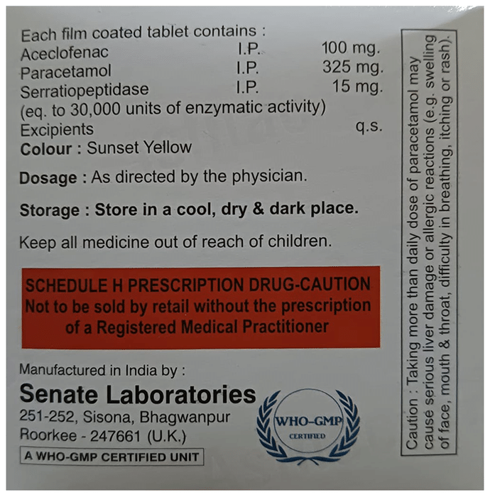 Marketer:Strebi Pharmaceuticals Private Limited,Composition:Aceclofenac (100mg) + Paracetamol (325mg) + Serratiopeptidase (15mg),medicine_type:,