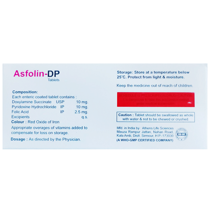 Manufacturer details:                                        Marketer details:Yashtraa Healthcare | A-501 Premium House,Opp.Gandhigram Railway Station, Ashram Road,Ellisbridge,Ahmedabad – 380009 (Gujarat), (O): 079 – 48011712, (M) : +91 9662355546,9173651275,                                                Description:Asfolin-DP Tablet is a combination medicine used in the treatment of nausea or vomiting during pregnancy. It blocks signals to reach the brain that trigger the feeling of nausea and vomiting. Asfolin-DP Tablet is taken with or without food in a dose and duration as advised by the doctor. The dose you are given will depend on your condition and how you respond to the medicine. You should keep taking this medicine for as long as your doctor recommends. If you stop treatment too early your symptoms may come back and your condition may worsen. Let your healthcare team know about all other medications you are taking as some may affect, or be affected by this medicine.The most common side effects are dryness in the mouth, constipation, and lightheadedness. Most of these are temporary and usually resolve with time. Contact your doctor straight away if you are at all concerned about any of these side effects. This medicine can also cause dizziness and sleepiness, so do not drive or do anything that requires mental focus until you know how this medicine affects you. Avoid drinking alcohol while taking this medicine as it can worsen your sleepiness.