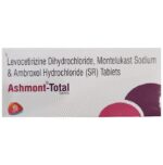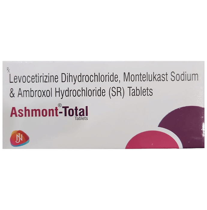 Manufacturer details:                                        Marketer details:Navjoie Healthcare | Pvt Office NO 32, 920/7, BISHAN SWARUP COMPLEX, WARD NO 07, MEHRAULI NEW DELHI – 110030,                                                Description:Ashmont-Total Tablet SR is a combination medicine used in the treatment of respiratory tract disorders associated with viscid mucus. It provides symptomatic relief of productive cough associated with respiratory tract disorders like bronchial asthma, bronchitis, and the common cold. Ashmont-Total Tablet SR may be taken with or without food in a dose and duration as advised by the doctor. The dose you are given will depend on your condition and how you respond to the medicine. You should keep taking this medicine for as long as your doctor recommends. If you stop treatment too early your symptoms may come back and your condition may worsen. Let your healthcare team know about all other medications you are taking as some may affect, or be affected by this medicine.The most common side effects are nausea, stomach upset, dryness in mouth, flu-like symptoms, fatigue, dizziness, and headache. Most of these are temporary and usually resolve with time. Contact your doctor straight away if you are at all concerned about any of these side effects. This medicine may also cause dizziness and sleepiness, so do not drive or do anything that requires mental focus until you know how this medicine affects you. Avoid drinking alcohol while taking this medicine as it can worsen your sleepiness.Before taking it, you should tell your doctor if you have any kidney or liver diseases so that your doctor can prescribe a suitable dose for you. You should also tell your doctor if you are pregnant, planning pregnancy or breastfeeding.
