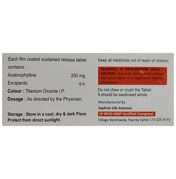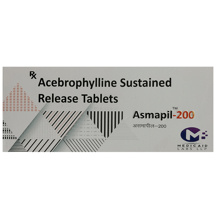 Manufacturer details:                                        Marketer details:Medicaid Labs LLP | AW-451, Sanjay Gandhi Transport Nagar,New Delhi-110042,                                                Description:Asmapil 200 Tablet SR is used to treat and prevent symptoms of asthma, bronchitis, and chronic obstructive pulmonary disorder (a lung disorder in which flow of air to the lung is blocked). It helps in relaxing the muscles of the air passages, thus widening it and making it easier to breathe. Asmapil 200 Tablet SR can be taken with the food in evening. Take it at the same time every day to get the most benefit. The dose and how often you take it depends on what you are taking it for. Your doctor will decide how much you need to improve your symptoms. Take this medicine for as long as it is prescribed for you. Do not miss even a single dose, if in any case, you missed a dose, take it as soon as you remember or better to skip the missed dose and continue with regular dosing. It does not work immediately or prevent the already started breathing trouble, hence always carry your medical inhaler with you for an emergency.The most common side effects of this medicine include abdominal discomfort, abdominal distension, vomiting, abdominal pain, diarrhea, constipation, and heart burn. If these bother you or appear serious, let your doctor know. There may be ways of reducing or preventing them. Generally, it is advised not to consume alcohol or do not smoke while on treatment.Before taking this medicine, let your doctor if you have kidney or liver disease or if you have heart-related problems. Your doctor should also know about all other medicines you are taking as many of these may make this medicine less effective or change the way it works. Inform your doctor if you are pregnant or breastfeeding before starting the treatment.