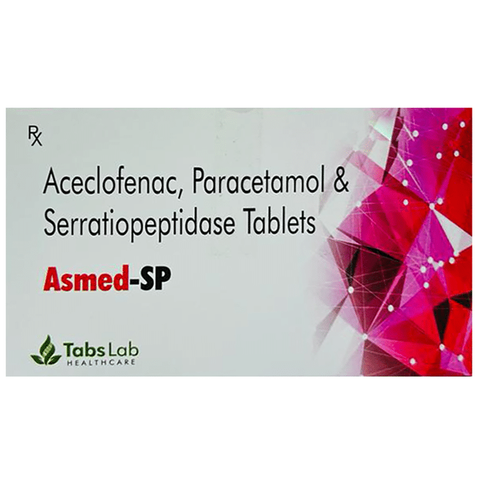Manufacturer details:                                        Marketer details:Tabs Lab Healthcare LLP | SHOP NO. 25, GROUND FLOOR, AGRO MALL, SECTOR-20, PANCHKULA 134117,                                                Description:Asmed-SP Tablet is a combination medicine used to relieve pain and swelling in various conditions like muscle pain, joint pain, and postoperative pain. Thus, it effectively alleviates pain and inflammation in conditions like rheumatoid arthritis, ankylosing spondylitis, and osteoarthritis. Asmed-SP Tablet should be taken in the dose and duration as advised by your doctor. It should be taken with food or milk to prevent stomach upset. Taking the medicine regularly at the right times increases its effectiveness. It is important to keep taking the medicine regularly until your doctor tells you it is safe to stop.Nausea, vomiting, stomach pain, indigestion, heartburn, increased liver enzymes, dizziness,drowsiness, and diarrhea are some of the common side effects that might be observed on taking this medicine. Your doctor may regularly monitor your kidney function, liver function, and levels of blood components if you are taking this medicine for long-term treatment. Long-term use may lead to serious complications such as stomach bleeding and kidney problems. Asmed-SP Tablet is not recommended if you are pregnant or breastfeeding.