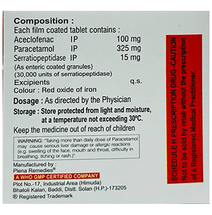 Marketer:Tabs Lab Healthcare LLP,Composition:Aceclofenac (100mg) + Paracetamol (325mg) + Serratiopeptidase (15mg),medicine_type:,