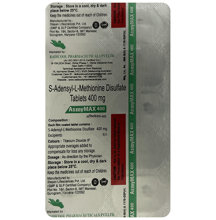 Manufacturer details:                                        Marketer details:Radicool Pharmaceutical Pvt Ltd | RZ-157 G/F, Tughlaqabad, near Okhla Phase-2 New Delhi-110062,                                                Description:Asmymax 400mg Tablet is a medicine used for the treatment of liver disease associated with reduced bile formation (intrahepatic cholestasis). It protects the liver cells from toxins and helps the liver to perform its normal functions. Asmymax 400mg Tablet may be taken with or without food. The dose will depend on the severity of your condition and your body weight. It is best swallowed whole, but you may need to break them to get the correct dose. This medicine needs to be taken regularly to get the most benefit and you may have to take it for several months or longer, so try to get into a routine. Keep using it as prescribed even if your symptoms disappear.Use of this medicine may cause some common side effects such as headache, dizziness, vomiting, upset stomach, diarrhea, constipation, and insomnia. Not everyone gets side effects. If you are worried about them, or they do not go away, let your doctor know. If you have problems with diarrhea your doctor may reduce the dose or stop the treatment. Drink enough water or fluids to stay hydrated in case of severe diarrhea and constipation.Before taking this medicine, you should tell your doctor if you are pregnant, planning pregnancy, or breastfeeding. Using this medicine can reduce or increase the effect of some other medicines so tell your doctor, all other medicines you are taking. Avoid drinking alcohol as it might increase side effects.