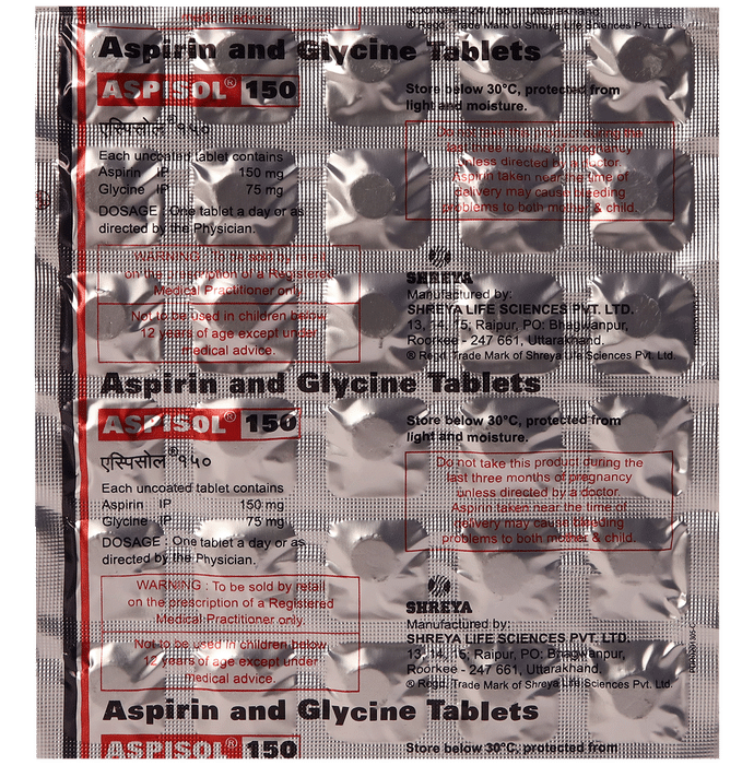 Manufacturer details:                                        Marketer details:Shreya Life Sciences Pvt Ltd | SHREYA HOUSE, 301/A, Pereira Hill Road, Andheri East, Mumbai – 400 099, India,                                                Description:Aspisol 150 Tablet is a combination of two medicine used for prevention of heart attack and stroke. It also prevents clot formation in the blood vessels. Aspisol 150 Tablet should be taken with food regularly at a fixed time each day. You should take it regularly at evenly spaced intervals as per the schedule prescribed by your doctor. Taking it at the same time every day will help you remember to take it. The dose and duration of treatment will depend on what you are being treated for. Do not stop taking it until you have finished the complete course, even when you feel better. Lifestyle changes like low-fat diet, exercise and not smoking may help this medicine to work better.Indigestion and diarrhea are some common side effects of this medicine. This medicine increases your risk of bleeding, so it is important to be careful while shaving, cutting nails and using sharp objects. Usually, it is advisable to avoid alcohol intake while taking this medicine.Before taking this medicine, tell your doctor if you have any liver or kidney disease. You must tell your doctor if you are pregnant, planning pregnancy or breastfeeding. You should also let your healthcare team know all other medicines you are taking as they may affect, or be affected by this medicine.