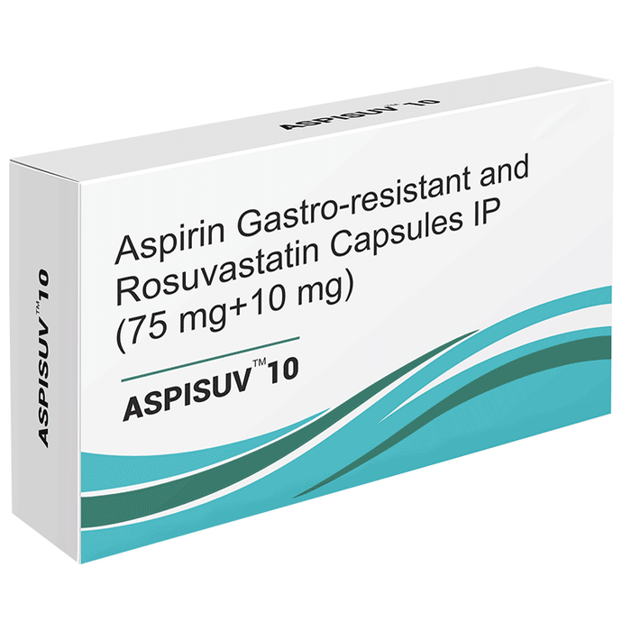 Manufacturer details: Marketer details:May and Baker Pharmaceuticals Ltd | 210 Mohan Place, Local Shopping Complex, Block-C, opp. Post Office, Saraswati Vihar, New Delhi – 110034, Description:Aspisuv 10 Capsule is a combination of two medicines used to prevent heart attack, stroke, and angina. This medicine reduces the ‘__’bad’__’ cholesterol (LDL) and triglycerides (fats) levels. Moreover, it also decreases the formation of blood clots. Aspisuv 10 Capsule should be taken with food to avoid stomach upset. You should take it regularly at evenly spaced intervals as per the schedule prescribed by your doctor. Taking it at the same time every day will help you remember to take it. The dose and duration of treatment will depend on what you are being treated for. Do not stop taking it until you have finished the complete course, even when you feel better. Lifestyle changes like low-fat diet, exercise and not smoking may help this medicine to work better.Nausea, abdominal pain, headache, and constipation are some common side effects of this medicine.This medicine increases your risk of bleeding, so it is important to be careful while shaving, cutting nails, using sharp objects, or engaging in contact sports (e.g., football, wrestling). Let your doctor know if you notice yellowing of skin, muscle pain or dark urine.Before taking this medicine, tell your doctor if you have liver or kidney disease or you are suffering from bleeding disorder. You must tell your doctor if you are pregnant, planning pregnancy or breastfeeding. You should also let your healthcare team know all other medicines you are taking as they may affect, or be affected by this medicine.