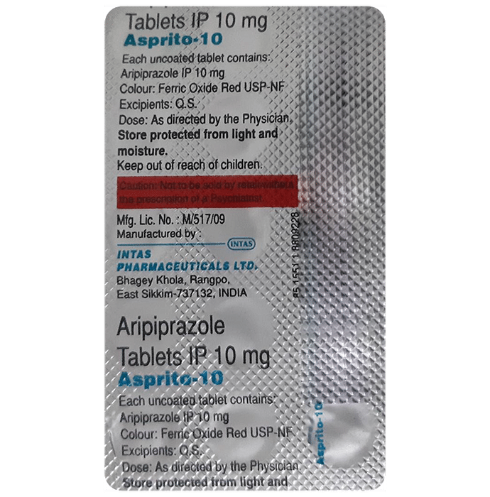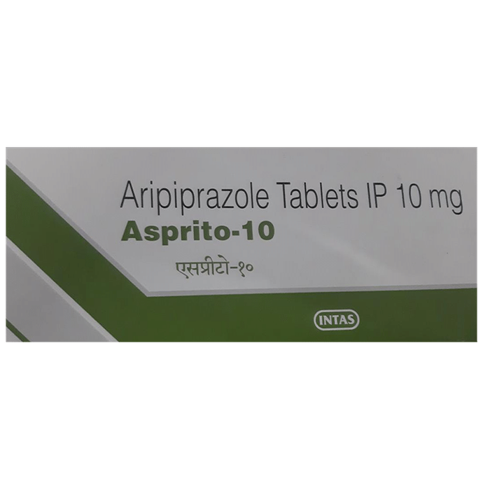 Manufacturer details:                                        Marketer details:Intas Pharmaceuticals Ltd | Chinubhai Centre, Off. Nehru Bridge, Ashram Road, Ahmedabad – 380009. Gujarat. India.,                                                Description:Asprito 10 Tablet is an antipsychotic medicine. It is used in the treatment of schizophrenia (a mental disorder that can result in hallucinations or delusions and also adversely affects a person’s ability to think and behave) and mania. It can also be used to treat depression and bipolar disorders. Asprito 10 Tablet is taken by mouth with or without food preferably at morning. However, it is advisable to take it at the same time each day as this helps to maintain consistent level of medicine in the body. Take this medicine in the dose and duration as advised by your doctor and if you have missed a dose, take it as soon as you remember. Do not skip any doses and finish the full course of treatment even if you feel better. It is important that this medication is not stopped suddenly without talking to doctor as it may worsen your symptoms. Some common side effects of this medicine includes nausea, vomiting, blurred vision, and dryness in mouth. Initially, this medicine may cause sudden drop in the blood pressure when you change positions, so it is better to rise slowly if you have been sitting or lying down. It also causes dizziness and sleepiness, so do not drive or do anything that requires mental focus until you know how this medicine affects you. This medicine may increase your blood sugar and cholesterol levels. However, modifying your lifestyle by having a healthy diet and doing exercise regularly can reduce this side effect. Remember to inform doctor if you develop any unusual changes in mood or behavior, new or worsening depression, or suicidal thoughts while taking this medicine.