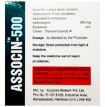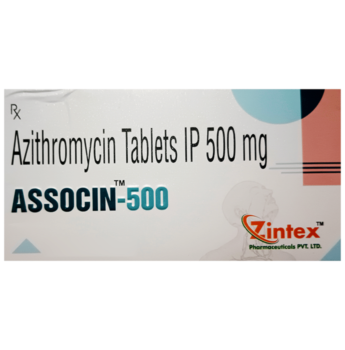 Manufacturer details:                                        Marketer details:Zintex Pharmaceuticals Pvt. Ltd. | S No- LGF 6,7 Radhikapuri,Indira Nagar, Sector 16, Lucknow, Uttar pradesh,                                                Description:Associn 500 Tablet is an antibiotic used to treat various types of bacterial infections of the respiratory tract, ear, nose, throat, lungs, skin, and eye in adults and children. It is also effective in typhoid fever and some sexually transmitted diseases like gonorrhea. Associn 500 Tablet is taken orally, preferably one hour before or 2 hours after a meal. It should be used regularly at evenly spaced time intervals as prescribed by your doctor. Do not skip any doses and finish the full course of treatment even if you feel better. Stopping the medicine too early may lead to the return or worsening of the infection.Commonly seen side effects seen with this medicine include vomiting, nausea, stomach pain, headache, and diarrhea. These are usually temporary and subside with the completion of treatment. Consult your doctor if you find these side effects worry you or persist for a longer duration.Do not use Associn 500 Tablet if you have a history of cholestatic jaundice or hepatic dysfunction that happened with the use of azithromycin. Inform your doctor if you have any previous history of allergy or heart problems before taking this medicine. Pregnant or breastfeeding women should consult their doctor before using this medicine.