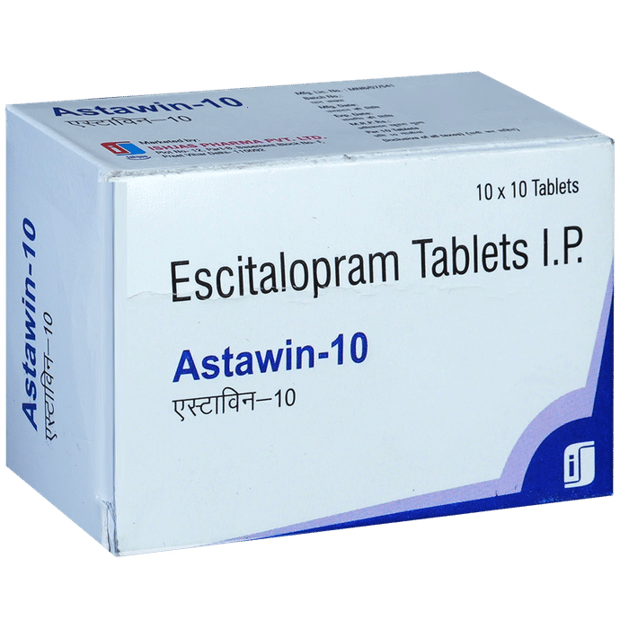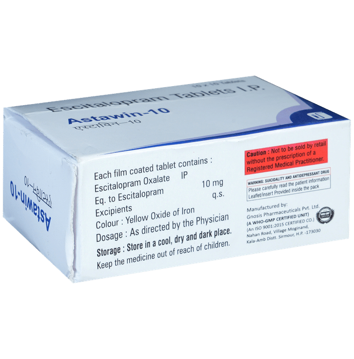 Manufacturer details:                                        Marketer details:Ishjas Pharma Pvt Ltd | X-936 GALI NO. 3, CHAND MOHALLA OPP. GBS SCHOOL GHANDHI NAGAR DELHI DL 110031 INDIA,                                                Description:Astawin 10mg Tablet is widely prescribed to treat depression and other mental health conditions like anxiety, panic disorder, and obsessive-compulsive disorder. It is a type of antidepressant known as a selective serotonin reuptake inhibitor (SSRI). Astawin 10mg Tablet helps recover from depression by improving mood and relieving anxiety and tension. It can be taken with or without food. The dose and how often you need it will be decided by your doctor based on the amount needed to control your symptoms. Your doctor may start you on a lower dose and increase it gradually. Do not change the dose or stop taking it without talking to your doctor, even if you feel well. Doing so may make your condition worse or you may suffer from unpleasant withdrawal symptoms such as anxiety, restlessness, palpitations, dizziness, sleep disturbances.To get the most benefit, take this medicine regularly at the same time each day. Your doctor may advise you to take it in the morning if you have trouble sleeping. It may take a few weeks before you start feeling better. Let your doctor know if you do not see any improvement even after 4 weeks.Some common side effects of this medicine include nausea, fatigue, increased sweating, insomnia (difficulty in sleeping), decreased sexual drive, delayed ejaculation, and women may experience difficulties achieving orgasm. Some people may experience sleepiness after taking this medicine. Let your doctor know straight away if you develop any sudden worsening of mood or any thoughts about harming yourself.Before taking Astawin 10mg Tablet, you should tell your doctor if you have epilepsy (seizure disorder or fits), diabetes, liver or kidney disease, any heart problems, or are currently taking medicines for depression known as MAO inhibitors. These may affect your treatment. Please tell your doctor about all the medicines you are taking to make sure you are safe.