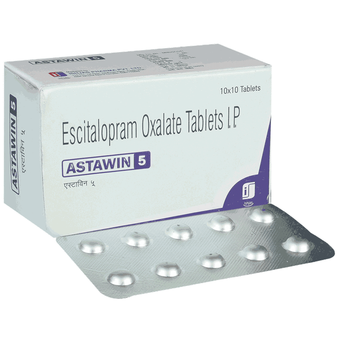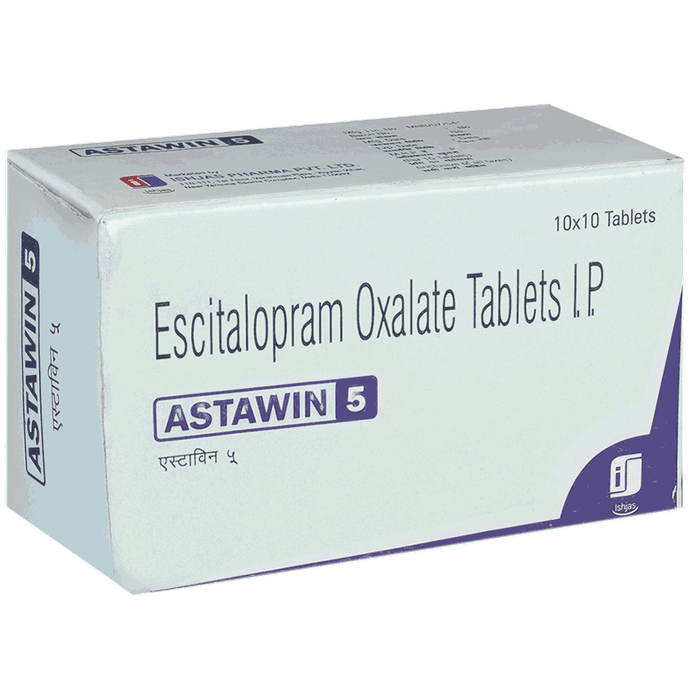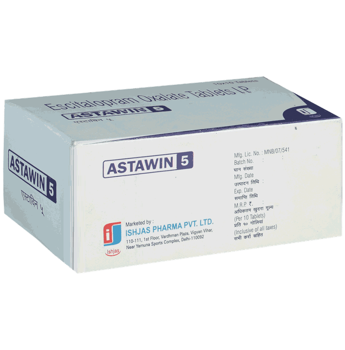 Manufacturer details:                                                                                Marketer details:Ishjas Pharma Pvt Ltd | X-936 GALI NO. 3, CHAND MOHALLA OPP. GBS SCHOOL GHANDHI NAGAR DELHI DL 110031 INDIA,                                                                                                Description:Astawin 5mg Tablet is widely prescribed to treat depression and other mental health conditions like anxiety, panic disorder, and obsessive-compulsive disorder. It is a type of antidepressant known as a selective serotonin reuptake inhibitor (SSRI). Astawin 5mg Tablet helps recover from depression by improving mood and relieving anxiety and tension. It can be taken with or without food. The dose and how often you need it will be decided by your doctor based on the amount needed to control your symptoms. Your doctor may start you on a lower dose and increase it gradually. Do not change the dose or stop taking it without talking to your doctor, even if you feel well. Doing so may make your condition worse or you may suffer from unpleasant withdrawal symptoms such as anxiety, restlessness, palpitations, dizziness, sleep disturbances.To get the most benefit, take this medicine regularly at the same time each day. Your doctor may advise you to take it in the morning if you have trouble sleeping. It may take a few weeks before you start feeling better. Let your doctor know if you do not see any improvement even after 4 weeks.Some common side effects of this medicine include nausea, fatigue, increased sweating, insomnia (difficulty in sleeping), decreased sexual drive, delayed ejaculation, and women may experience difficulties achieving orgasm. Some people may experience sleepiness after taking this medicine. Let your doctor know straight away if you develop any sudden worsening of mood or any thoughts about harming yourself.Before taking Astawin 5mg Tablet, you should tell your doctor if you have epilepsy (seizure disorder or fits), diabetes, liver or kidney disease, any heart problems, or are currently taking medicines for depression known as MAO inhibitors. These may affect your treatment. Please tell your doctor about all the medicines you are taking to make sure you are safe.