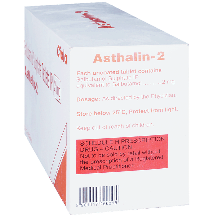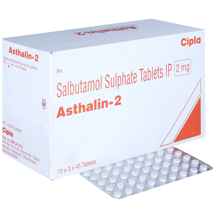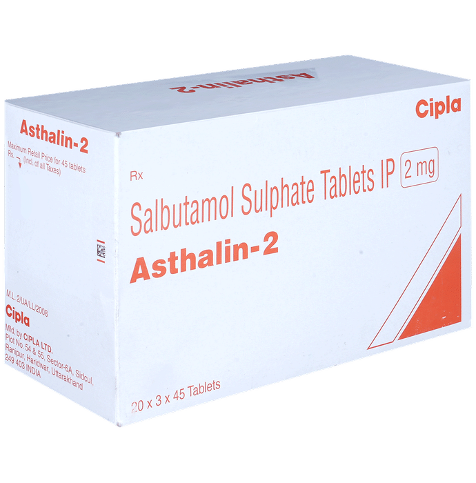 Manufacturer details:                                                                                Marketer details:Cipla Ltd | Cipla House, Peninsula Business Park, Ganpatrao Kadam Marg, Lower Parel, Mumbai-400013,                                                                                                Description:Asthalin 2 Tablet is used to relieve symptoms of asthma and chronic obstructive pulmonary diseases (COPD) such as coughing, wheezing, and breathlessness. It helps in relaxing the muscles of the air passages, thus widening it and making it easier to breathe. You can take Asthalin 2 Tablet with or without food. The dose will depend on your condition and how you respond to the medicine. Try to take it at the same time each day. It is important to keep taking this medicine until your doctor tells you not to. Use this medicine regularly to get the most benefit from it even if you feel well.This medicine is generally safe however it may cause tremors, headaches, palpitation, fast heart rate, nervousness, and muscle cramps in some people. These are often not dangerous and should gradually improve as your body gets used to the medicine. There are other, rarer, side effects and you should call your doctor straight away if you get chest pain, a very bad headache, or very bad dizziness.Before using this medicine, you should tell your doctor if you have high blood pressure, an overactive thyroid gland, a history of heart problems, diabetes, or low levels of potassium in your blood to make sure it is safe. Also, make sure your doctor knows if you are pregnant or breastfeeding before taking this medicine. This medicine can make you feel dizzy or shaky so avoid driving, cycling, or using tools or machinery until you feel better. You should not smoke as it causes damage to your lungs and will make your condition worse.