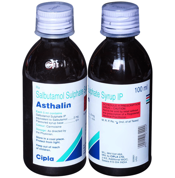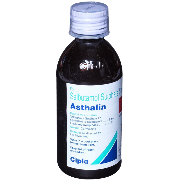Manufacturer details:                                                                                Marketer details:Cipla Ltd | Cipla House, Peninsula Business Park, Ganpatrao Kadam Marg, Lower Parel, Mumbai-400013,                                                                                                Description:Asthalin Syrup is used to relieve symptoms of asthma and chronic obstructive pulmonary diseases (COPD) such as coughing, wheezing, and breathlessness. It helps in relaxing the muscles of the air passages, thus widening it and making it easier to breathe. You can take Asthalin Syrup with or without food. The dose will depend on your condition and how you respond to the medicine. Try to take it at the same time each day. It is important to keep taking this medicine until your doctor tells you not to. Use this medicine regularly to get the most benefit from it even if you feel well.This medicine is generally safe however it may cause tremors, headaches, palpitation, fast heart rate, nervousness, and muscle cramps in some people. These are often not dangerous and should gradually improve as your body gets used to the medicine. There are other, rarer, side effects and you should call your doctor straight away if you get chest pain, a very bad headache, or very bad dizziness.Before using this medicine, you should tell your doctor if you have high blood pressure, an overactive thyroid gland, a history of heart problems, diabetes, or low levels of potassium in your blood to make sure it is safe. Also, make sure your doctor knows if you are pregnant or breastfeeding before taking this medicine. This medicine can make you feel dizzy or shaky so avoid driving, cycling, or using tools or machinery until you feel better. You should not smoke as it causes damage to your lungs and will make your condition worse.