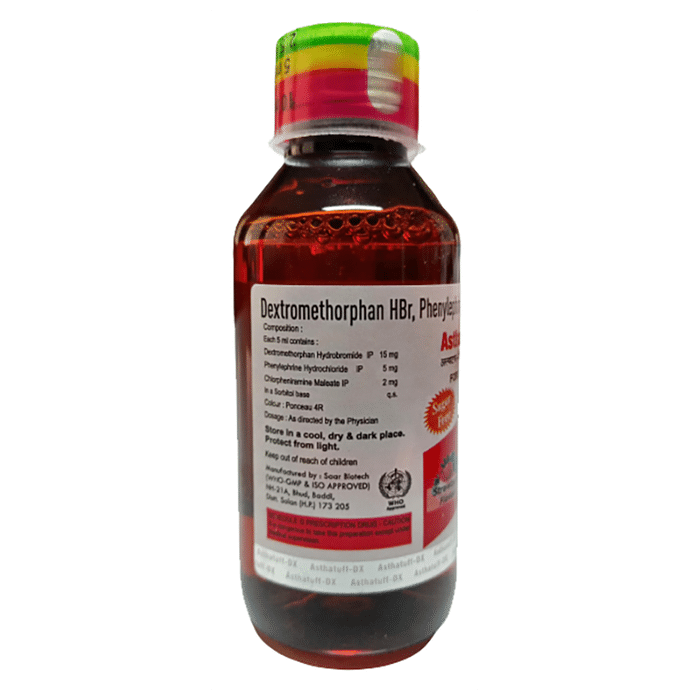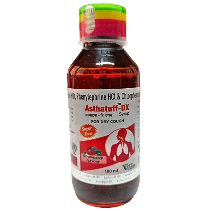 Manufacturer details:                                        Marketer details:Tuhi Lifesciences Pvt. Ltd. | 86/1 Agrawal Nagar Indore Indore MP 452001,                                                Description:Asthatuff-DX Syrup Strawberry Sugar Free is a medicine used in the treatment of common cold and cough. It can provide quick relief from cough and common cold symptoms like runny nose, stuffy nose, sneezing, watery eyes, and congestion or stuffiness. Asthatuff-DX Syrup Strawberry Sugar Free is taken with or without food in a dose and duration as advised by the doctor. The dose you are given will depend on your condition and how you respond to the medicine. You should keep taking this medicine for as long as your doctor recommends. If you stop treatment too early your symptoms may come back and your condition may worsen. Let your healthcare team know about all other medications you are taking as some may affect, or be affected by this medicine.Common side effects of this medicine include headache, sedation, double vision, vomiting, diarrhea, dry mouth, and nausea. Most of these are temporary and usually resolve with time. Contact your doctor straight away if you are at all concerned about any of these side effects. This medicine can also cause sleepiness, so do not drive or do anything that requires mental focus until you know how this medicine affects you. Avoid drinking alcohol while taking this medicine as it can worsen your sleepiness.Never support self-medication or recommend your medicine to another person. It is beneficial to have plenty of fluids while taking this medication. Before taking this medicine, you should tell your doctor if you are pregnant, planning pregnancy or breastfeeding. You should also tell your doctor if you have any kidney or liver diseases so that your doctor can prescribe a suitable dose for you.