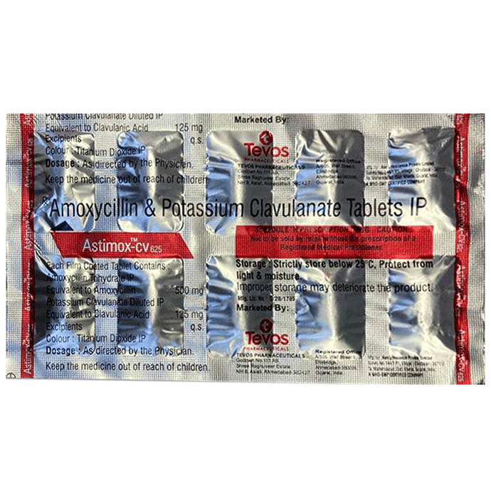 Manufacturer details:                                        Marketer details:Tevos Pharmaceuticals | The S.K House , 7/A Santosh Baug Society (Second Floor), Near to Nagri Eye Hospital, Gujarat College Road, Ellisbridge, Ahmedabad, Gujarat 380006..,                                                Description:Astimox-CV 625 Tablet is an antibiotic that helps your body fight infections caused by bacteria. It is used to treat infections of the lungs (e.g., pneumonia), ear, nasal sinus, urinary tract, skin, and soft tissue. It will not work for viral infections such as the common cold. Astimox-CV 625 Tablet is best taken with a meal to reduce the chance of a stomach upset. You should take it regularly at evenly spaced intervals as per the schedule prescribed by your doctor. Taking it at the same time daily will help you remember to take it. The dose will depend on what you are being treated for, but you should always complete an entire course of this antibiotic as your doctor prescribes. Please do not stop taking it until you have finished, even when you feel better. If you stop taking it early, some bacteria may survive, and the infection may return or worsen.The most common side effects of Astimox-CV 625 Tablet include nausea, diarrhea, vomiting, fungal infections of the mouth, skin fold or vagina, skin rashes, and vaginitis. These are usually mild, but let your doctor know if they bother you or will not go away.Before taking it, let your doctor know if you are allergic to any antibiotics or have kidney or liver problems. You should also inform your healthcare team about all other medicines you are taking as they may affect or be affected by Astimox-CV 625 Tablet. This medicine is generally considered safe to use during pregnancy and breastfeeding if prescribed by a doctor.