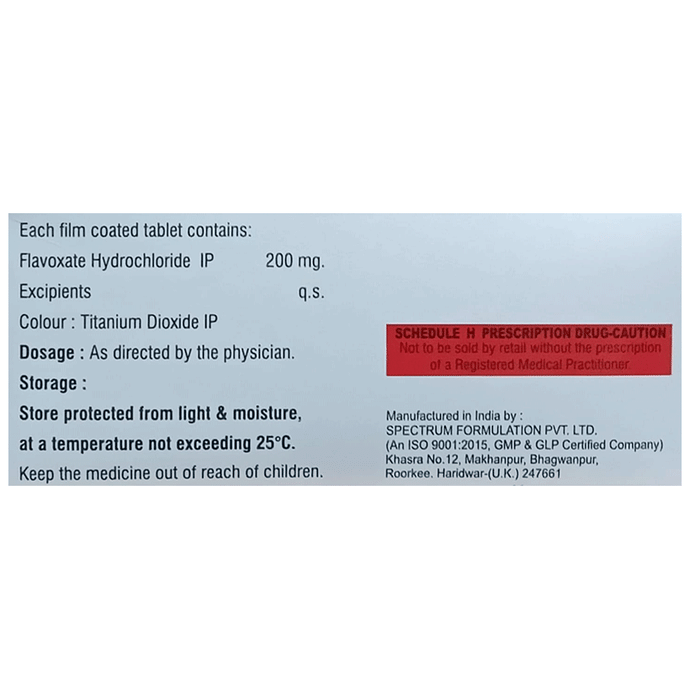 Package:Strip,Qty:10,Product Form:Tablet ,prescription_required:Prescription Required,Fact_Box:Chemical Class :: Spasmolytic Flavone Derivative|Habit Forming :: No|Therapeutic Class :: UROLOGY|Action Class :: Direct antispasmodic (Bladder), primary_use:Treatment of Muscle spasms of the urinary tract,storage:Store below 25°C,                                    common_side_effect:Nausea | Vomiting | Dryness in mouth | Headache | Drowsiness | Dizziness | Blurred vision | Nervousness | Sweating | Fever | Palpitations,            MANUFACTURER_ADDRESS:E-56, Ind Area Phase 8, Mohali,               country_of_origin:India,Q_A:</q_a>,                                                       How it works:,