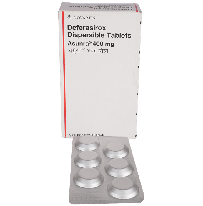 Manufacturer details:                                        Marketer details:Novartis India Ltd | Sandoz House, Shiv Sagar Estate, Worli Mumbai -400 018, India,                                                Description:Asunra 400mg Tablet DT is a medicine used in the treatment of chronic iron overload caused by frequent blood transfusion. It helps remove the excess iron from the body and reduce the risk of it causing organ damage. Asunra 400mg Tablet DT should be taken on an empty stomach. Take it in the exact dose and duration and take it regularly at a fixed time each day to get the maximum benefit from it.Using of Asunra 400mg Tablet DT may cause common side effects such as nausea, headache, constipation, and diarrhea. If the side effects persist or worsen, inform your doctor.Before using this medicine, let your doctor know if you have any kidney or liver diseases. Let your doctor also know about all the other medicines you are taking to ensure your safety.