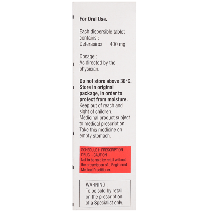 Package:Strip,Qty:6,Product Form:Tablet DT ,prescription_required:Prescription Required,Fact_Box:Chemical Class :: Triazole & benzoate derivative|Habit Forming :: No|Therapeutic Class :: BLOOD RELATED|Action Class :: Iron chelating agents, primary_use:Treatment of Iron overload,storage:Store below 30°C,                  common_side_effect:Nausea | Headache | Vomiting | Rash | Abdominal pain | Constipation | Itching | Abdominal distension | Diarrhea,      MANUFACTURER_ADDRESS:Sandoz House, Shiv Sagar Estate, Worli Mumbai -400 018, India,        country_of_origin:Switzerland,Q_A:</q_a>,                            How it works:,