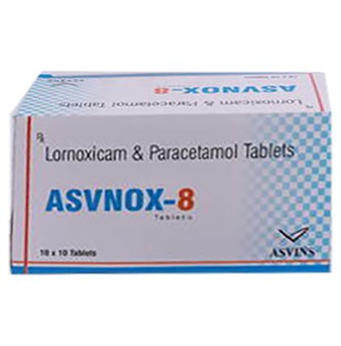 Manufacturer details:                                        Marketer details:Asvins Lifecare | Plot No. 233, 2nd Floor, Cabin No. 3 Sector 12-A, Rally, Panchkula- 134109, Haryana, India,                                                Description:Asvnox 8 Tablet is a pain-relieving medicine. It is used to treat pain and inflammation in conditions like rheumatoid arthritis, ankylosing spondylitis, and osteoarthritis. It is also used to relieve muscle pain, back pain, toothache, or pain in the ear and throat. Asvnox 8 Tablet is best taken in an empty stomach. The dose will depend on what you are taking it for and how well it helps your symptoms. You should take it as advised by your doctor. Do not take more or use it for a longer duration than recommended by the doctor.The most common side effects of this medicine include nausea, vomiting, indigestion, stomach pain, and diarrhea. If any of these side effects bother you or get worse, you should let your doctor know. Your doctor may be able to suggest ways of preventing or reducing the side effects.Before taking it, you should let your doctor know if you have a history of ulcer or bleeding in your stomach, high blood pressure, or have any trouble with your heart, kidneys, or liver. Let your doctor also know about all the other medicines you are taking because they may affect, or be affected by, this medicine.Pregnant or breastfeeding women should consult their doctor before starting treatment. You should also avoid drinking alcohol while you are taking this medicine, as alcohol can cause excessive drowsiness.