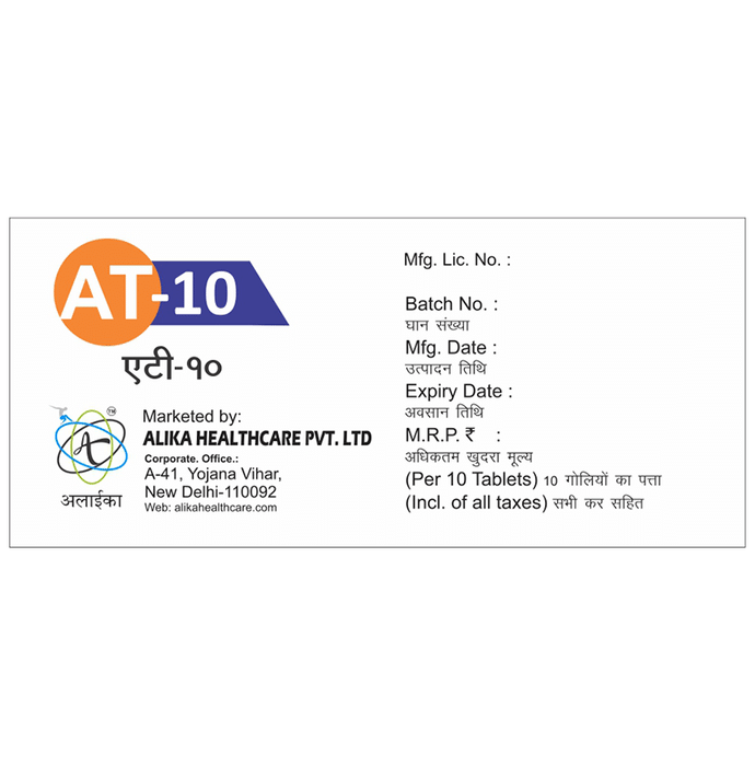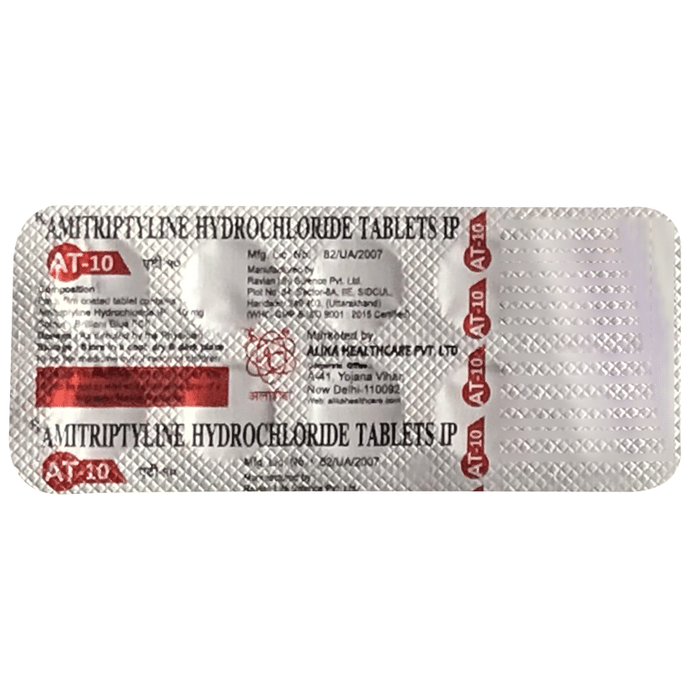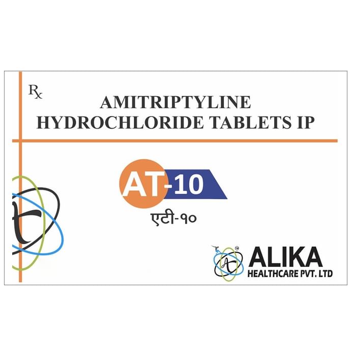 Manufacturer details:                                                                                Marketer details:Alika Healthcare Pvt Ltd | Kalyani Niwas, I.M.A Hall Road Salimpur Ahara Bihar,                                                                                                Description:AT 10 Tablet is a tricyclic antidepressant. Different doses of this medicine help in treating and preventing different problems such as depression, neuropathic pain, and migraine. AT 10 Tablet is normally taken before bedtime because it can make you feel sleepy. It can be taken with or without food. The dose and how often you need to take it will be decided by your doctor so that you get the right amount to control your symptoms. The initial dose should be increased with great caution under close supervision. This medicine may not work straight away and it could be several weeks before you get the full effects.How long you need to use it will depend on what you are taking it for, but it is important to continue taking this medication even if you feel well. Do not stop taking the medicine suddenly without talking to your doctor. Stopping the medicine suddenly can worsen your conditions or cause other symptoms. Your dose may be modified or gradually decreased before stopping the medication.The most common side effects of this medicine include nausea, constipation, sweating, dry mouth, sleepiness, tremor, dizziness, headache, speech disorder, accommodation disorder, increased heart rate, orthostatic hypotension, and nasal congestion. It may also make you aggressive or confused and can lead to weight gain in some people.This medicine is not addictive, but you can experience additional side effects (withdrawal symptoms) if you stop taking it suddenly. Most of the common side effects tend to be mild. Your doctor may be able to suggest ways of preventing or reducing side effects if they bother you or do not go away. Serious side effects associated with this medicine are rare.