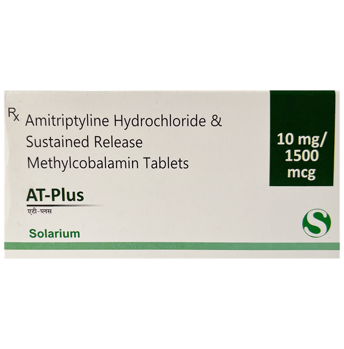 Manufacturer details:                                                                                Marketer details:Solarium Pharmaceuticals | Door No.1406, 17-A Main 1 B Cross J.P. Nagar Bangalore Bangalore KA 560078 IN,                                                                                                Description:AT-Plus Tablet SR is a combination of two medicines used to treat neuropathic pain. It works by protecting the nerve fibers against damage, repairing the damaged nerves. This way it effectively relieves the pain sensation and also elevates the mood. AT-Plus Tablet SR may be taken with or without food. However, it is advised to take it at the same time each day as this helps to maintain a consistent level of medicine in the body. Take this medicine in the dose and duration advised by your doctor. If you miss a dose of this medicine, take it as soon as you remember. Finish the full course of the treatment even if you feel better. It is important not to stop taking this medicine suddenly.Some common side effects of this medicine include constipation, dry mouth, difficulty in urination, drowsiness, blurred vision, and increased heart rate. It may also cause dizziness and sleepiness, so do not drive or do anything that requires mental focus until you know how this medicine affects you. However, these are temporary and usually resolve on their own. Please consult your doctor if these do not subside or bother you.You should avoid alcohol while taking AT-Plus Tablet SR, as it may worsen certain side effects. This medicine can also lead to weight gain, eat a healthy balanced diet, avoid snacking with high-calorie food, and exercise regularly. Inform your doctor if you develop any unusual changes in mood or behavior, new or worsening depression, or suicidal thoughts or behavior.