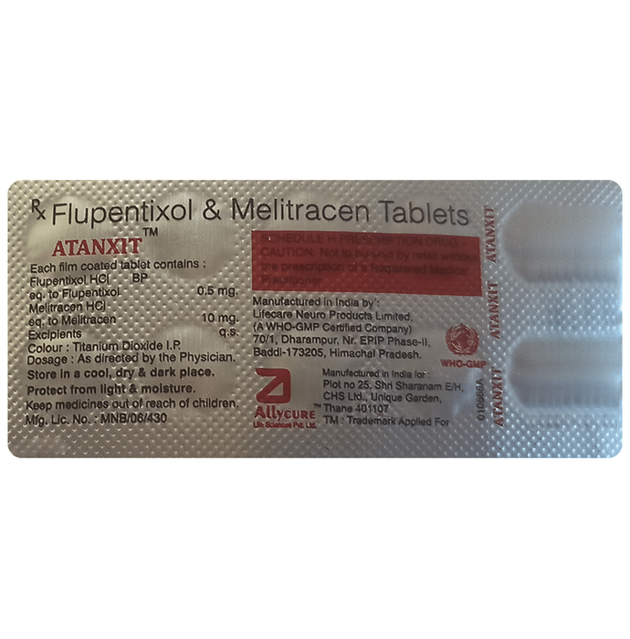 Manufacturer details:                                        Marketer details:Allycure Lifesciences Pvt Ltd | plot no 25, shri sharnam, E/H CHS LTD, unique garden Thane , 401107,                                                Description:Atanxit Tablet is a combination of two medicines used in the treatment of depression. It helps by increasing the level of chemical messengers in the brain that relaxes the brain and nerves, thus treating your depression. Atanxit Tablet may be taken with or without food. Take it at the same time each day as this helps to maintain a consistent level of medicine in the body. Take it in the dose and duration as advised by your doctor. This medication mustn’t be stopped suddenly without talking to your doctor as that may worsen your symptoms.Some common side effects of Atanxit Tablet include dry mouth, constipation, urinary retention, blurred vision, increased heart rate, muscle rigidity, restlessness, and tremor. Initially, this medicine may cause a sudden drop in blood pressure when you change positions, rise slowly if you have been sitting or lying down. It may also cause dizziness and sleepiness, do not drive or do anything that requires mental focus until you know how this medicine affects you.Before taking it, inform your doctor if you are suffering from thyroid or kidney disease, epilepsy, Parkinson’s disease, glaucoma, or any heart disease. This medicine can also lead to weight gain, eat a healthy balanced diet, avoid snacking with high-calorie food, and exercise regularly.