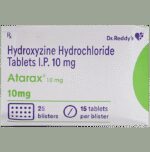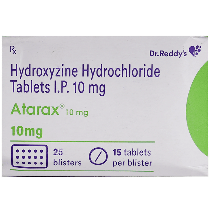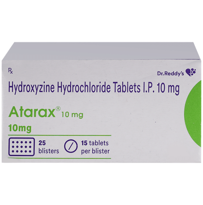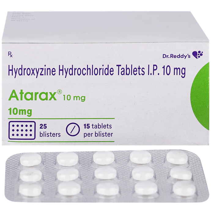Manufacturer details:                                        Marketer details:Dr Reddy’s Laboratories Ltd | Dr. Reddy’s Laboratories Ltd., Village Malpur, P.O.Bhud, Baddi, Dist. Solan, H.P.,                                                Description:Atarax 10mg Tablet is used to treat anxiety and helps to get relaxed before or after surgery. It is also used to treat symptoms of skin allergy like itching, swelling, and rashes in conditions such as eczema, dermatitis, and psoriasis. Atarax 10mg Tablet should be taken with or without food. Take it exactly as your doctor has prescribed. The dose and how often you take it depends on what you are taking it for. Your doctor will decide how much you need to improve your symptoms. Take it for as long as it is prescribed for you. In case, you have missed any doses, take the next dose as soon as you remember it. However, you should never take a double dose.The most common side effects of this medicine include sedation, nausea, vomiting, stomach upset, and constipation. If these bother you or appear serious, let your doctor know. There may be ways of reducing or preventing them. You must avoid driving or attention-seeking activity while on treatment.Before taking this medicine, let your doctor know if you have heart problems or have high blood pressure, have liver or kidney problems. Inform your doctor if you are pregnant, or breastfeeding. Your doctor should also know about all other medicines you are taking as many of these may make this medicine less effective or change the way it works. Generally, it is advised to avoid alcohol while on treatment.