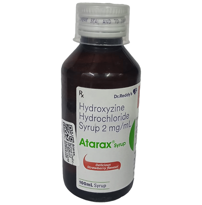 Manufacturer details:                                                                                Marketer details:Dr Reddy’s Laboratories Ltd | Dr. Reddy’s Laboratories Ltd., Village Malpur, P.O.Bhud, Baddi, Dist. Solan, H.P.,                                                                                                Description:Atarax Syrup Delicious Strawberry is used to treat anxiety and helps to get relaxed before or after surgery. It is also used to treat symptoms of skin allergy like itching, swelling, and rashes in conditions such as eczema, dermatitis, and psoriasis. Atarax Syrup Delicious Strawberry should be taken with or without food. Take it exactly as your doctor has prescribed. The dose and how often you take it depends on what you are taking it for. Your doctor will decide how much you need to improve your symptoms.  Take it for as long as it is prescribed for you. In case, you have missed any doses, take the next dose as soon as you remember it. However, you should never take a double dose.The most common side effects of this medicine include sedation, nausea, vomiting, stomach upset, and constipation.  If these bother you or appear serious, let your doctor know. There may be ways of reducing or preventing them. You must avoid driving or attention-seeking activity while on treatment.Before taking this medicine, let your doctor know if you have heart problems or have high blood pressure, have liver or kidney problems. Inform your doctor if you are pregnant, or breastfeeding. Your doctor should also know about all other medicines you are taking as many of these may make this medicine less effective or change the way it works. Generally, it is advised to avoid alcohol while on treatment.