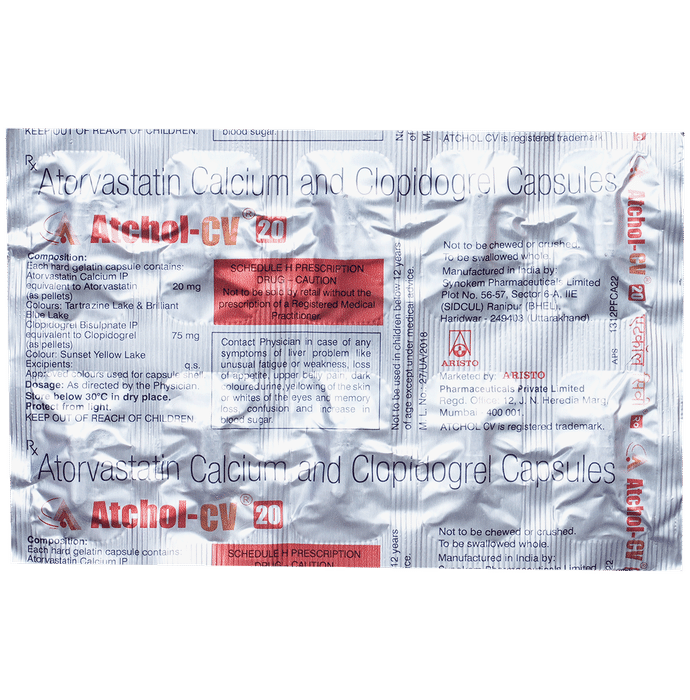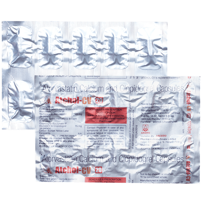 Manufacturer details: Marketer details:Aristo Pharmaceuticals Pvt Ltd | Mercantile Chamber, 3rd Floor, 12, J.N. Heredia Marg, Ballard Estate, Mumbai – 400 001, India., Description:Atchol CV 20mg/75mg Capsule is a combination of two medicines used to prevent heart attack and stroke. This medicine reduces the ‘__’bad’__’ cholesterol (LDL) and triglycerides (fats) levels. Moreover, it also decreases the formation of blood clots. Atchol CV 20mg/75mg Capsule should be taken with food to avoid stomach upset. You should take it regularly at evenly spaced intervals as per the schedule prescribed by your doctor. Taking it at the same time every day will help you remember to take it. The dose and duration of treatment will depend on what you are being treated for. Do not stop taking it until you have finished the complete course, even when you feel better. Lifestyle changes like low-fat diet, exercise and not smoking may help this medicine to work better.Nausea, abdominal pain, and headache are some common side effects of this medicine. This medicine increases your risk of bleeding, so it is important to be careful while shaving, cutting nails, using sharp objects, or engaging in contact sports (e.g., football, wrestling). Let your doctor know if you notice yellowing of the skin, muscle pain or dark urine.Before taking this medicine, tell your doctor if you have liver or kidney disease or you are suffering from bleeding disorder. You must tell your doctor if you are pregnant, planning pregnancy or breastfeeding. You should also let your healthcare team know all other medicines you are taking as they may affect, or be affected by this medicine.