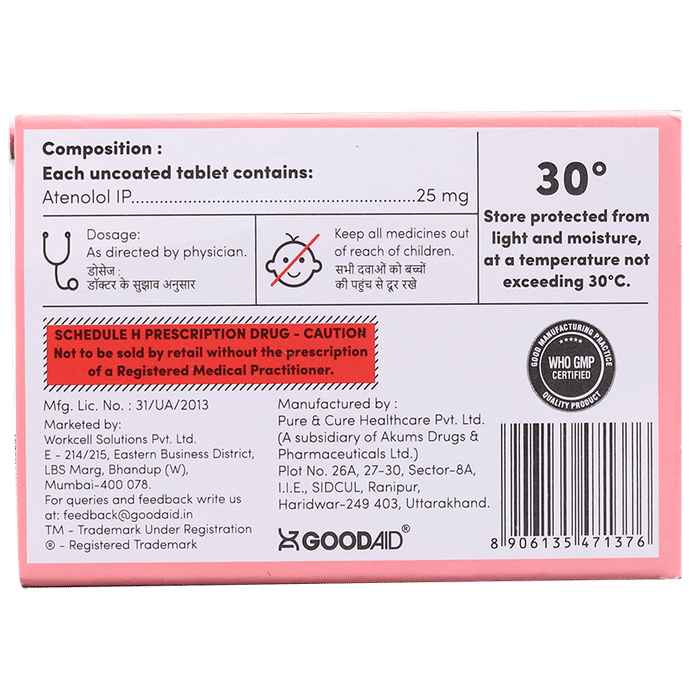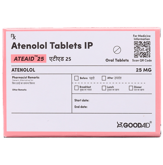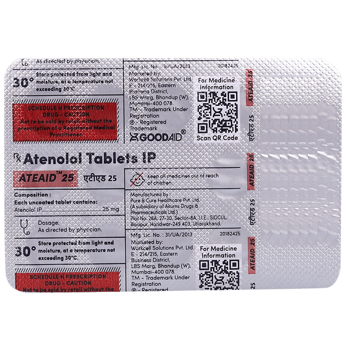 In Treatment of Angina (heart-related chest pain) Ateaid 25 Tablet relaxes the blood vessels so that blood can flow more easily around your body and makes sure that your heart is getting a good supply of oxygen. This makes it less likely that you will suffer chest pain caused by angina. This medicine can help increase your ability to exercise and go about your daily life more easily by reducing the frequency of angina attacks. You should take it regularly and as long as it is prescribed for it to work effectively.