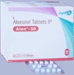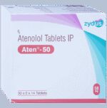 Manufacturer details:                                                                                Marketer details:Zydus Cadila | Zydus Tower, Satellite Cross Roads,Ahmedabad – 380015 Gujarat, India.,                                                                                                Description:Aten 50 Tablet belongs to a group of medicines called beta-blockers. It is used to treat high blood pressure (hypertension), angina (heart-related chest pain), irregular heart rhythms (arrhythmia). It also helps to prevent future heart attacks and stroke. Aten 50 Tablet may be prescribed alone or together with other medications. The dose and frequency depend on what you are taking it for and the severity of your condition. It may be taken empty stomach or with a meal, but take it regularly at the same time each day to get the most benefit. It may take several weeks before you get the full benefit of this medicine and you may need to take it for the rest of your life. However, it is important to continue taking it even if you feel well. Most people with high blood pressure do not feel ill and if you stop taking it, your condition may worsen.The main side effects of this medicine are fatigue, slow heart rate, feeling dizzy, diarrhea, and nausea. These are usually mild and short-lived. It may also cause shortness of breath or low blood pressure in some people. To reduce the risk of side effects your doctor will probably start the medicine at a low dose and gradually increase it. Consult your doctor if the side effects bother you or do not go away.Before taking it, let your doctor know if you have any liver problems. It may also not be suitable for people who have a slow heart rate, severe circulation problems, severe heart failure, or low blood pressure. Pregnant or breastfeeding mothers should also consult their doctor before taking it. You must talk to your doctor to find out whether this medicine is suitable for you to use. You should have your blood pressure checked regularly to make sure that this medicine is working properly. Avoid drinking alcohol as it may increase certain side effects.