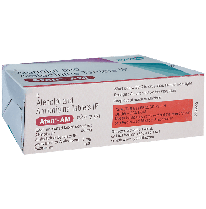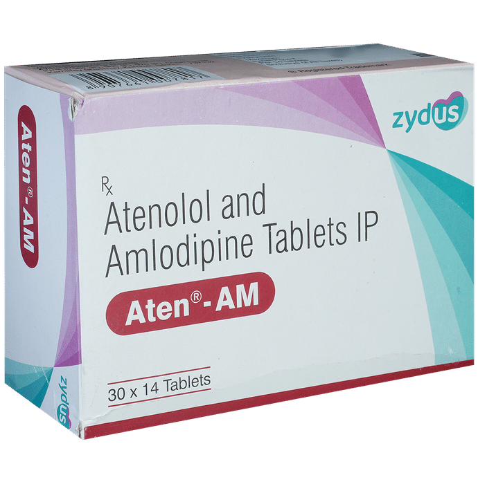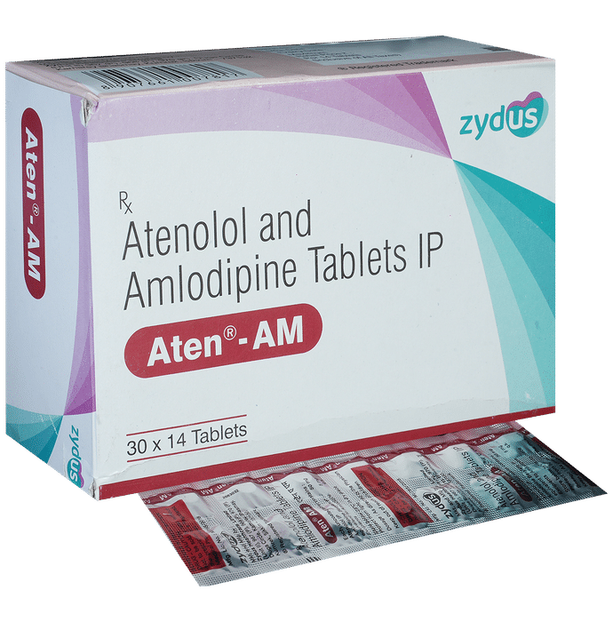 Manufacturer details:                                        Marketer details:Zydus Cadila | Zydus Tower, Satellite Cross Roads,Ahmedabad – 380015 Gujarat, India.,                                                Description:Aten AM Tablet is used to treat hypertension (high blood pressure) and angina. This is a combination of two medicines that controls blood pressure when a single medication is not effective. It helps to lower high blood pressure and thus reduces the chances of future heart attack and stroke. Aten AM Tablet may be taken with or without food. Take it at the same time each day. Keep taking it for as long as advised by your doctor. Even if you feel well, do not stop this medicine on your own because high blood pressure often has no symptoms. If you stop taking it, your condition may get worse. Keeping active with regular exercise, reducing your weight and eating a healthy diet will also help control your blood pressure. Follow your doctor’s advice while taking this medicine.It may cause side effects like headache, slow heart rate, and nausea. It may also cause dizziness, so do not drive or do anything that requires mental focus until you know how this medicine affects you. This might raise the level of potassium in the blood, hence avoid potassium rich food or supplements. You may be asked for regular monitoring of blood pressure, kidney function, and electrolytes level while on the treatment.Before taking it, let your doctor know if you have any liver or kidney problems. Pregnant or breastfeeding women should also consult their doctor for advice before taking this medicine. You also need to tell your doctor what other medicines you are taking especially those used to treat high blood pressure or heart conditions.