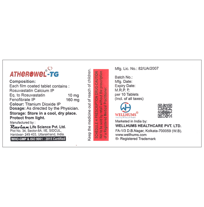 Manufacturer details:                                        Marketer details:Wellhums Healthcare Pvt. Ltd. | F-1, 5th FLOOR, FA1/3 D B NAGAR, KOLKATA-700060 www.wellhums.com,                                                Description:Atherowel-TG Tablet is a combination of two lipids (fat) lowering medicines. It is used to lower the levels of lipids known as cholesterol and triglycerides in the blood when lifestyle changes (eg. low-fat diet) on their own have failed. This medicine helps to reduce the risk of heart disease. Atherowel-TG Tablet can be taken with a meal or on an empty stomach. You can take it at any time of the day but try to take it at the same time each day. This will help you remember to take it. Your doctor will prescribe the right dose depending on your lipid levels and how you respond to this medicine. Most people with high cholesterol and triglyceride do not feel ill, but stopping your medicine may increase your lipid levels, making your condition worse and increasing your risk of heart disease and stroke.It is important to have your cholesterol and triglyceride levels (lipid profile) checked regularly. This medicine is only one part of a treatment program which should also include a healthy low-fat diet, regular exercise, smoking cessation, moderation of alcohol intake, and weight reduction. You can eat normally while taking this medicine, but try to avoid foods that are high in fat.Nausea, stomach pain, constipation, headache, flatulence (excessive gas), and muscle pain are some of the common side effects of this medicine. These are usually mild and disappear after a short time. Consult your doctor if they persist or if you notice any yellowing of your eyes, unusual bleeding or bruising, or get repeated, severe, or unexplained muscle pains. You may be advised to get your liver function tested periodically while taking this medicine.This medicine should not be used in conditions such as liver disease (eg. abnormal blood tests for liver function, persistent yellowness of eyes, etc.). Before taking it, let your doctor know if you have any kidney-related problems or if you are pregnant, planning a pregnancy, or breastfeeding. Diabetic patients should monitor their blood sugar levels while taking this medicine, as it may lead to an increase in blood sugar levels.